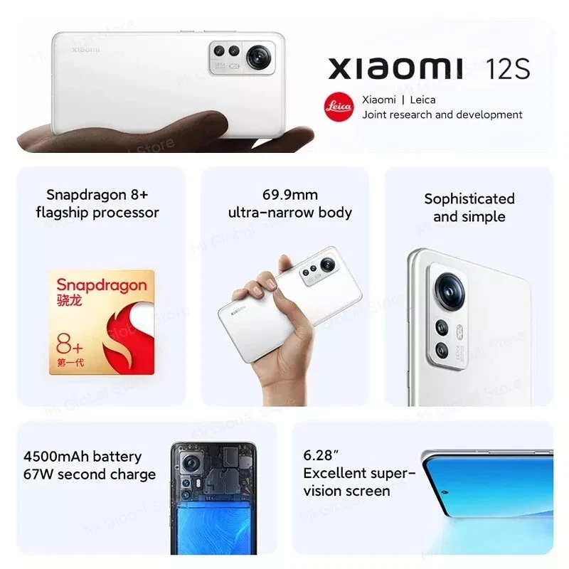 Store Categories Store Categories Other Xiaomi 12S (5G) 256/512GB 50MP 6.28" Snapdragon 8+ Gen 1 4500mAh Triple Cameras Product Description You are buying Brand New Original Unlocked Xiaomi 12S Smartphone Carrier and Activation Factory Unlocked: This Phone works with any International Sim Card. Please insert your sim card into the phone and follow the on-screen instructions to activate. Xiaomi 12S Features: CN Version Xiaomi 12S > CPU ----------- Snapdragon® 8 Gen 1 Octa Core >Screen--------6.28″ AMOLED Flexible Screen; 120Hz Refresh Rate ; 240Hz touch sampling rate; 2400 x 1080 FHD+ 419PPI >RAM+ROM-- 8GB+128GB / 8GB+256GB / 12GB+256GB / 12GB+512GB >Camera------ 50MP + 13MP + 5MP Triple rear camera, 32MP front camera >Battery-------4500mAh (typ) battery, 67W fast charging >OS------------CN Version , MIUI 13, >Other---------Bluetooth 5.2 , WIFI 6 >Network------Full Netcom, Dual SIM Dual Standby 5G:n1 / n3 / n5 / n8 / n28a(703MHz-733MHz,758MHz-788MHz) / n38 / n40 / n41 / n77 / n78 Note: the actual network and frequency band usage depends on the deployment of local operators. N3, N5 and N8 frequency bands need to be supported by software upgrades after being released by operators; 4G:FDD-LTE:B1 / B2 / B3 / B4 / B5 / B7 / B8 / B18 / B19 / B26 TDD-LTE:B34 / B38 / B39 / B40 / B41 / B42 Note: LTE B41 (2496-2690 194mhz); 3G:WCDMA:B1 / B2 / B4 / B5 / B6 / B8 / B19 2G:GSM:B2 / B3 / B5 / B8;CDMA 1X:BC0 Support 4 × 4 MIMO antenna technology hpue ho RXD Item Condition Brand New This item is Brand New, sealed in the original packaging from the manufacturer. Network Technology GSM / CDMA / HSPA / EVDO / LTE / 5G 2G bands GSM 850 / 900 / 1800 / 1900 - SIM 1 & SIM 2 CDMA 800 3G bands HSDPA 800 / 850 / 900 / 1700(AWS) / 1900 / 2100 CDMA2000 1xEV-DO 4G bands 1, 2, 3, 4, 5, 7, 8, 18, 19, 26, 34, 38, 39, 40, 41, 42 5G bands 1, 3, 5, 8, 28, 38, 40, 41, 77, 78 SA/NSA Speed HSPA, LTE, 5G Launch Announced 2022, July 04 Status Available. Released 2022, July 07 Body Dimensions 152.7 x 69.9 x 8.2 mm or 8.7 mm Weight 179 g / 182 g (6.31 oz) Build Glass front (Gorilla Glass Victus), glass back or eco leather back, aluminum frame SIM Dual SIM (Nano-SIM, dual stand-by) Display Type AMOLED, 68B colors, 120Hz, Dolby Vision, HDR10+, 1100 nits (peak) Size 6.28 inches, 95.2 cm 2 (~89.2% screen-to-body ratio) Resolution 1080 x 2400 pixels, 20:9 ratio (~419 ppi density) Protection Corning Gorilla Glass Victus Platform OS Android 12, MIUI 13 Chipset Qualcomm SM8475 Snapdragon 8+ Gen 1 (4 nm) CPU Octa-core (1x3.19 GHz Cortex-X2 & 3x2.75 GHz Cortex-A710 & 4x1.80 GHz Cortex-A510) GPU Adreno 730 Memory Card slot No Internal 256GB 8GB RAM, 256GB 12GB RAM, 512GB 12GB RAM UFS 3.1 Main Camera Triple 50 MP, f/1.9, 24mm (wide), 1/1.28", 1.22µm, dual pixel PDAF, OIS 13 MP, f/2.4, 15mm, 123˚ (ultrawide), 1/3.06", 1.12µm 5 MP, f/2.4, 50mm (telephoto macro), AF Features Leica lens, Dual-LED dual-tone flash, HDR, panorama Video 8K@24fps, 4K@30/60fps, 1080p@30/60fps, 720p@1920fps, gyro-EIS Selfie camera Single 32 MP, f/2.5, 26mm (wide), 0.7µm Features HDR, panorama Video 1080p@30/60fps, 720p@120fps, HDR Sound Loudspeaker Yes, with stereo speakers 3.5mm jack No 24-bit/192kHz Hi-Res audio Tuned by Harman Kardon Snapdragon Sound Comms WLAN Wi-Fi 802.11 a/b/g/n/ac/6e, dual-band, Wi-Fi Direct Bluetooth 5.2, A2DP, LE, aptX HD, aptX Adaptive Positioning GPS (L1+L5), GLONASS (L1), BDS (B1I+B1c+B2a), GALILEO (E1+E5a), QZSS (L1+L5), NavIC (L5) NFC Yes Infrared port Yes Radio No USB USB Type-C 2.0, OTG Features Sensors Fingerprint (under display, optical), accelerometer, gyro, proximity, compass, color spectrum Battery Type Li-Po 4500 mAh, non-removable Charging 67W wired, PD3.0, QC4, 100% in 42 min (advertised) 50W wireless, 100% in 57 min (advertised) 10W reverse wireless Misc Colors Gray, White, Purple, Green Models 2206123SC Pa ckage include : 1* Retail Box 1 * Xiaomi 12S Smartphone 1* Charger 1* Cable 1* Manual About: Pleas e contact us and do not give us Negative or Neutral feedback If you are not satisfied with the product or service. We will try our best to give you a satisfactory solution. Please give us a positive feedback If you are satisfied with our product and service. It only just takes you 1 minute. Aftersale Service Shipping Policy Returns Policy payment Customs Aftersale Service 1. Please contact us before leave feedaback or open any return case if you have any problem. Communication i s the best way to make things right. we have beening doing phone busienss for more than 10years. We are a responsibl e seller We promise you that we will provide a good solution for all your concerns if you contact us first. 2.Our working time is BeiJing time 9:00 am to 6:00 pm. Hope you can give us more patient to wait if you can't receive us promptly reply beside our working time. Your satisfication is our most goal !!!!! Shipping Policy We ship items to your EBAY confirmed address only. Your delivery address cannot be changed after payment has been made. For safety and fast delivery, Your specific address and Phone number are required. We are unable to take any responsibility for wrong address, any custom delay or tax. Transit time is highly depended and provided by Postal Service. All items will be dispatched within3 business day after receipt of payment. Please notice that orders placed on weekends and public holidays will be dispatched on the next working day. It may take longer to other countries or remote areas. If you have not received your shipment within 20 days from payment, please contact us. We will track the shipment and get back to you as soon as possible with a reply. Our goal is 100% customer satisfaction. Returns Policy 1. This product has a one-year warranty. If the item has any problem in 1 month. We can provide a exchange or refund service. If over 1 month. We can help you to fixed the item. Buyers must contact us before sending the defective item. 2. Our warranty does not extend to any products that are physically damaged o
