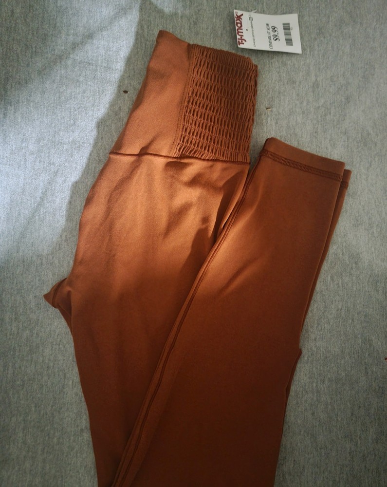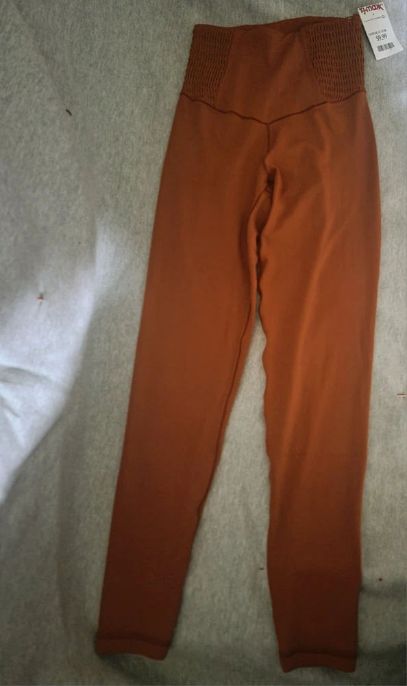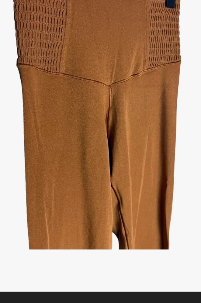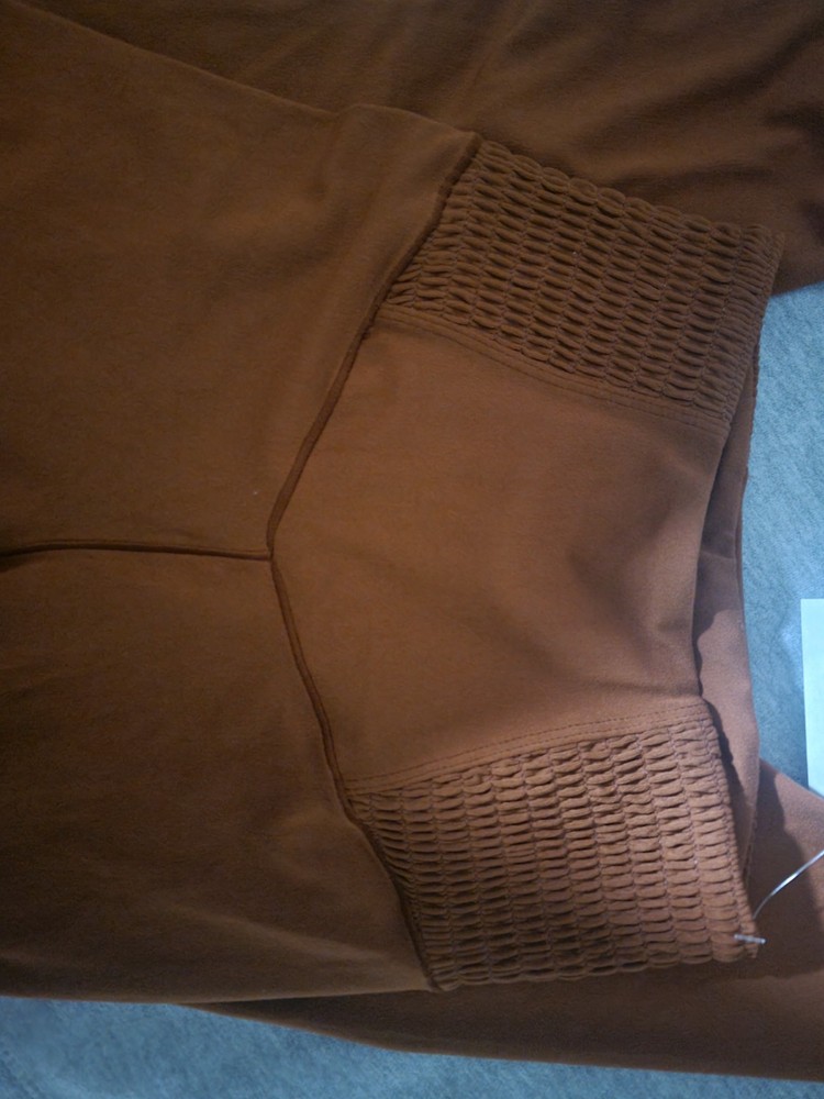 never worn. for small waist. shirred sides on waist. camel brown color. tags still on. very soft