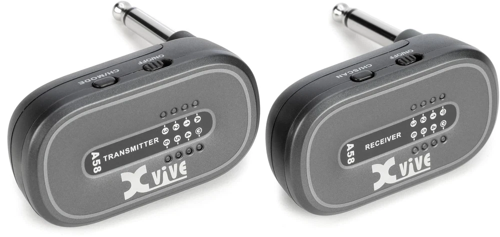 Cut the Cord with Confidence With its ability to tackle guitar, bass, and any other electric instrument with the same degree of assurance, the Xvive A58 makes the prospect of going wireless incredibly appealing. The A58 spans the full 20Hz–20kHz frequency range, and at less than 5ms of latency, you’ll never need to worry about your wireless guitar system stealing your mojo. Moreover, since it operates in the 5.8GHz frequency band, you won't experience interference from other nearby wireless devices. The A58 includes six switchable channels, enabling you to use six systems simultaneously, and its auto-scan feature makes setup fast and easy. Showcasing a massive 100-foot operating range and five hours of battery life, the Xvive A58 will render your cables obsolete.Delivers interference-free performance To state the obvious, wireless devices are a fixture in the modern world. And since most wireless devices operate at 2.4GHz, deploying a 2.4GHz wireless guitar Sweetwater is an Authorized Xvive Dealer Genuine Open Box Item Sweetwater's 2-year warranty Xvive A58 Wireless Guitar System Wireless Guitar System with 6 Switchable Channels and Auto Scan - 5.8GHz Cut the Cord with Confidence With its ability to tackle guitar, bass, and any other electric instrument with the same degree of assurance, the Xvive A58 makes the prospect of going wireless incredibly appealing. The A58 spans the full 20Hz–20kHz frequency range, and at less than 5ms of latency, you’ll never need to worry about your wireless guitar system stealing your mojo. Moreover, since it operates in the 5.8GHz frequency band, you won't experience interference from other nearby wireless devices. The A58 includes six switchable channels, enabling you to use six systems simultaneously, and its auto-scan feature makes setup fast and easy. Showcasing a massive 100-foot operating range and five hours of battery life, the Xvive A58 will render your cables obsolete. Delivers interference-free performance To state the obvious, wireless devices are a fixture in the modern world. And since most wireless devices operate at 2.4GHz, deploying a 2.4GHz wireless guitar system is simply asking for trouble. That’s why Xvive created the A58. It's designed to operate across the 5.8GHz frequency band, thereby avoiding the congested 2.4GHz band altogether. When we put the A58 through its paces here at Sweetwater, we found that it can be used anywhere — even in the midst of a high-powered Wi-Fi network — with zero dropouts or intermittent bursts of static. Xvive A58 Features: Works equally well with guitar, bass, and other electric instruments Spans the full 20Hz–20kHz frequency range with less than 5ms of latency 5.8GHz operating frequency prevents interference from other wireless devices 6 switchable channels enable the simultaneous use of 6 systems Intuitive auto-scan feature makes setup fast and easy Offers an operating range of 100 ft. Integrated rechargeable 780mAh Li-ion battery provides 5 hours of battery life Specification Detail Configuration Complete System System: Analog/Digital Digital System: Frequency Range 5.8 GHz System: Operating Range 100 ft. Line-of-sight System: Frequency Response 20Hz-20kHz Transmitter: Form Factor Plug Transmitter: Dynamic Range 110dB (A weighted) Transmitter: Battery Type Lithium-ion rechargeable Transmitter: Battery Life Up to 5 hours Transmitter: Connector 1 x 1/4" Receiver: Type Plug Receiver: Outputs 1/4" Receiver: Power Source Lithium-ion rechargeable RETURN INFORMATION We want you to be completely happy with your purchase from Sweetwater. If you are not satisfied with your product, you may return it for a refund of the purchase price within 30 days. If your purchase was eligible for Free Shipping, the shipping cost will be deducted from your credit or refund. Returns must be in the complete and original packaging with all accessories and complete documentation (Owner's Manual, warranty card, quick start guides, etc.), show no signs of wear or use, and include a Return Authorization number or be subject to a restocking fee.