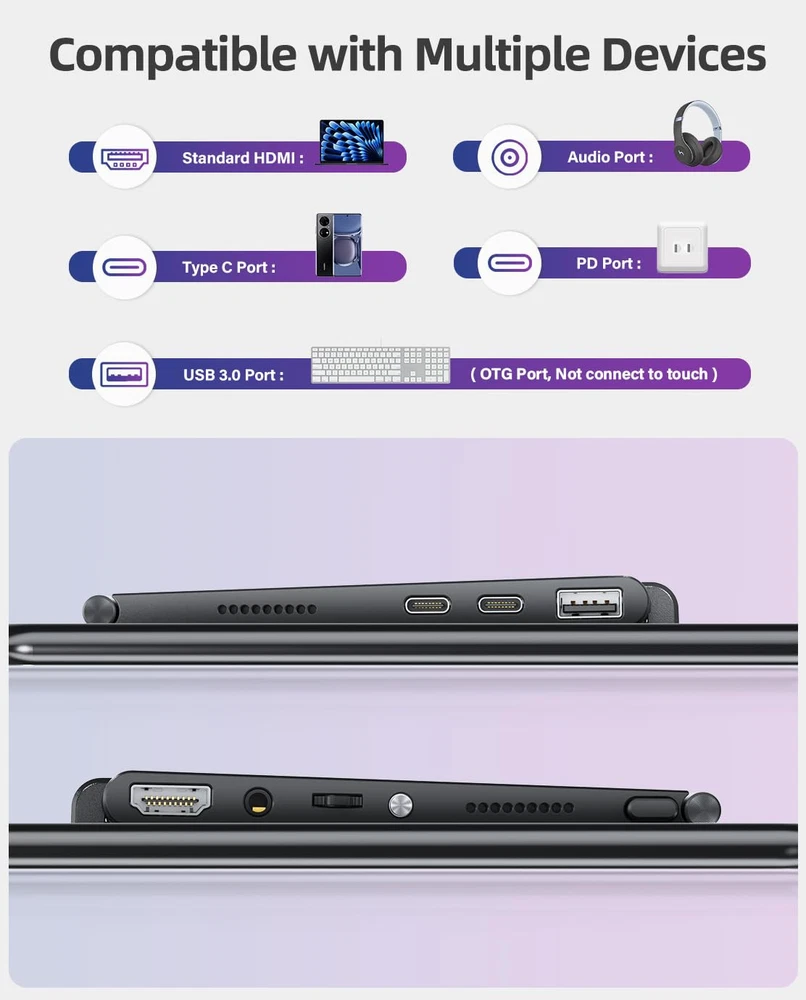 2024 Innovative Adjustable Kickstand: The First monitor achieving freeswitching between landscape and portrait mode in 0-110°adjustable viewing angle, fits your different working requirements perfectly; All ports integrated on the mini kickstand, makes all cables invisible automatically and connections more stable; Before using the monitor, please download and read the User Guide below 10-point Capacitive Touchscreen Monitor: Compatible with all system of PC, & Chrome; Adopted G+FF technology, support much more precise and sensitive touch, no extra driver needed, just connect the USB cable to your device to achieve the touch; NOTE: To realize the touch function, there must be a USB C to A or USB C to C cable connected to the USB C port on the monitor to your device directly; The touch function does not support right-click and long-press to activate the option operation Full-featured Port Only for : Built in Standard HDMI port that plug-in test over 5000 times and more 2000 times than mini HDMI port; USB 3.0 port that can connect to keyboard or mouse directly and without any more adapter; Type C port that support one usb-c cable to display & power First Portable Screen with 2000:1 Contrast Ratio: The 2000:1 high contrast ratio of the hardware will make the screen have better "shading performance", allowing you to see more dark and bright details, but will not overburden the bright parts; It is roughly equivalent to a natural HDR effect of "non-brightness and non-coding"; 100% sRGB High Color Gamut deliver you brighter, crisper, and more natural colors Entertainment Upgraded with Colorful Flowing Atmosphere Lights: First portable monitor built in Ambient Light and it has 10 working mode: Vivid, Colorful, White, Purple, Blue, Cyan, Green, Yellow, Orange, Red, put you in the world of gaming e-sports; Low-power Mode has also been added to this monitor, just choose what you need; We provide 3-year service and 24-hour customer service; Please rest assured that any issues will be promptly resolved within 8 hours