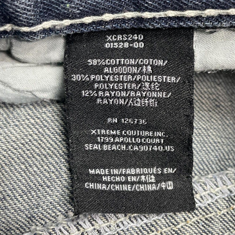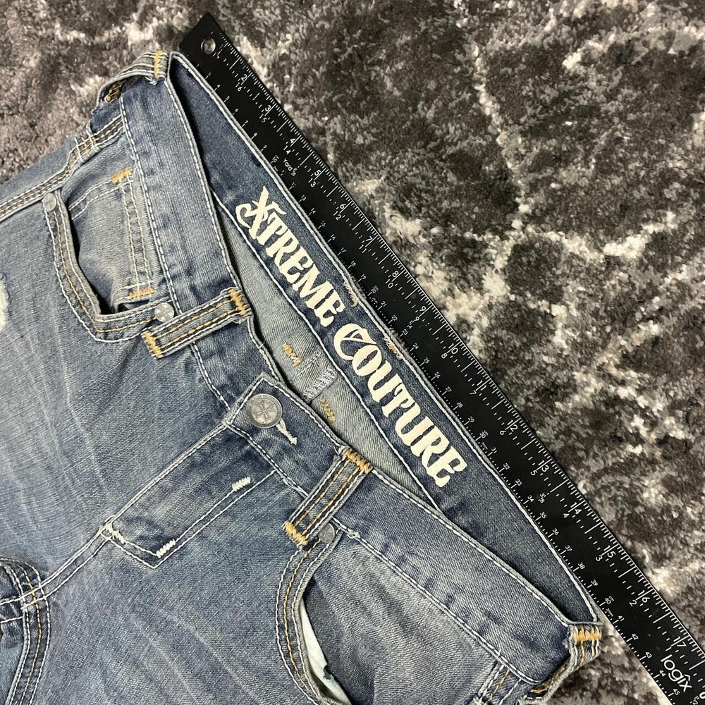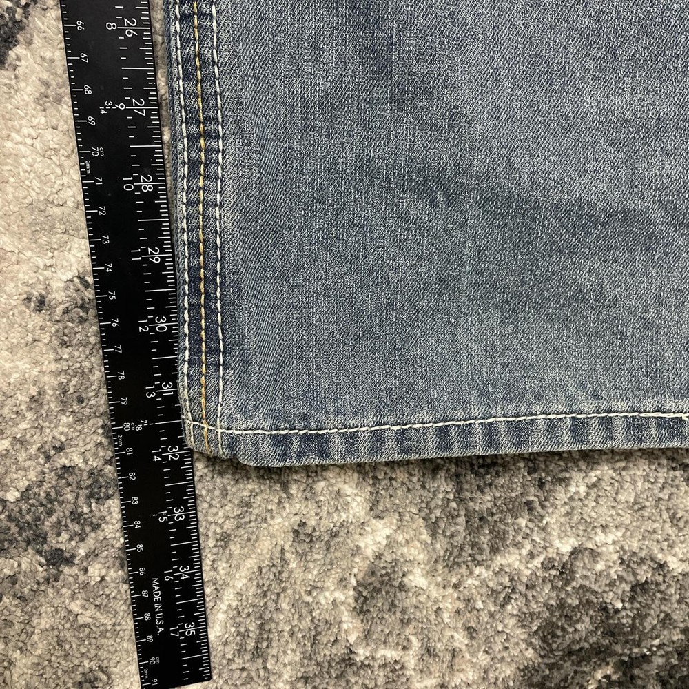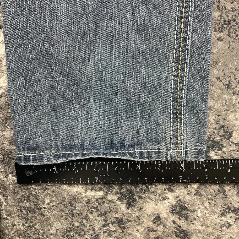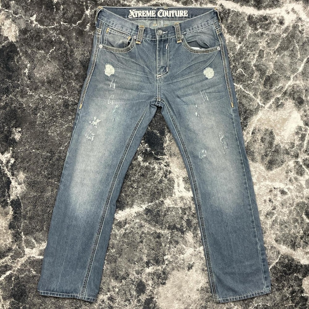 • Great condition, just a small hole in left pocket + missing button on back right pocket (pictured last and item discounted). Distressing on front is manufactured & intentional by designer • Waist: 32" Inseam: 32", Leg Opening: 9" • Items shipped everyday Monday through Saturday. Feel free to message if you have additional questions.