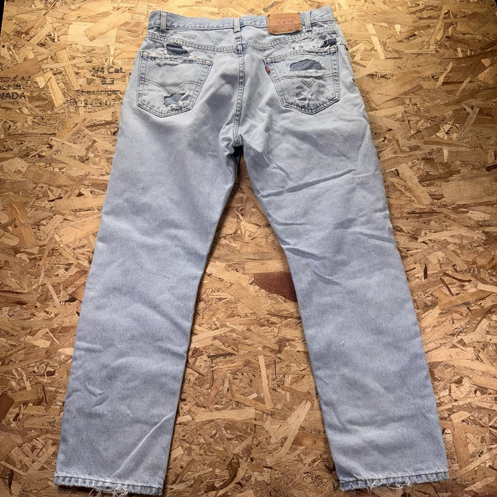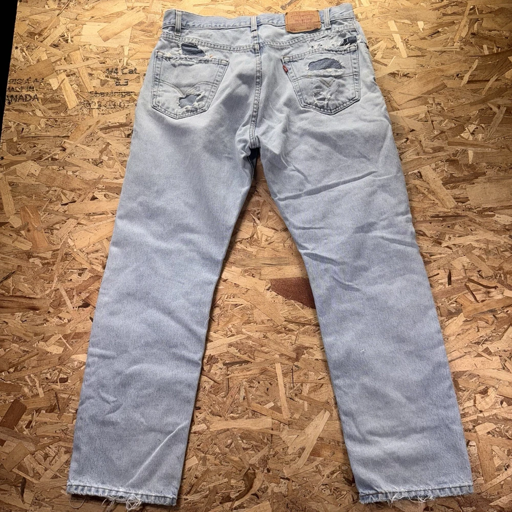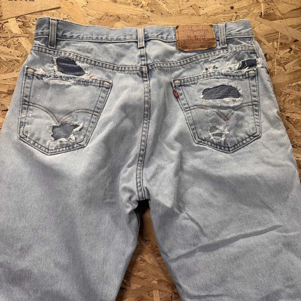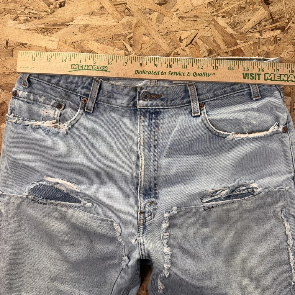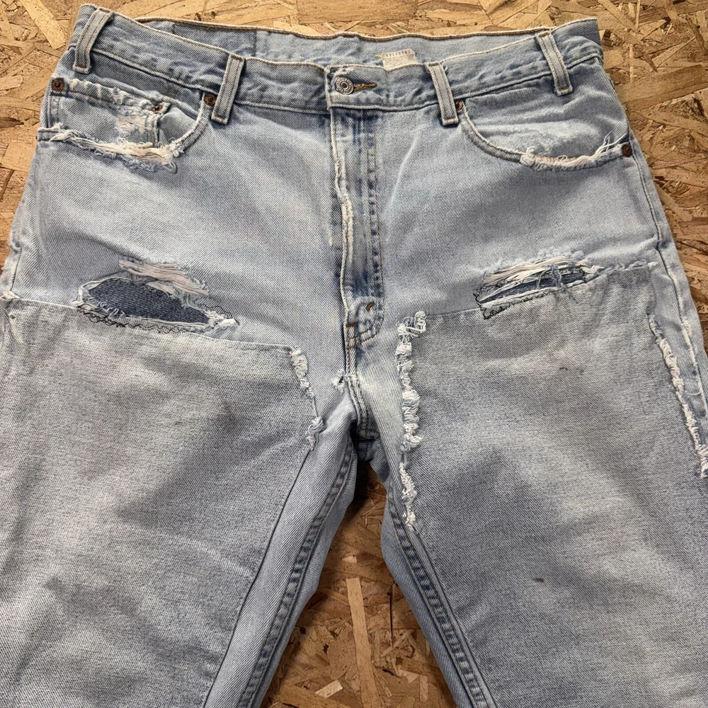 Thrashed with double knee patches. Various areas are perfectly distressed. See pics for all measurements