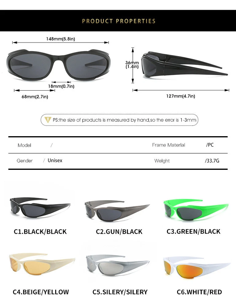 SPECIFICATIONS Brand Name : kajila Origin : Mainland China Applicable Scenarios : TRAVEL Gender : WOMEN Style type : PUNK Model Number : XY-20941 Item Type : EYEWEAR Product Type : Riding sunglasses Department Name : ADULT Frame Material : Plastic Element type : Trendy and fashionable Hign-concerned Chemical : None Lenses Material : Polycarbonate Lenses Optical Attribute : MIRROR Lenses Optical Attribute : Gradient Lenses Optical Attribute : UV400 Lens Height : 36 Lens Width : 68 Place Of Origin : China (mainland) Eyewear Type : Sunglasses Certification : CE Feature 1 : Y2K Punk Sunglasses Feature 2 : Sports Sunglasses Feature 3 : Fashion Sunglasses Feature 4 : Retro 2000's Sunglasses Feature 5 : Vintage Sunglasses Feature 6 : Steampunk Sunglasses Choice : yes semi_Choice : yes Economy Shipping We usually use AliExpress Standard Shipping or Registered China Post Airmail and it takes about 2-6 weeks for delivery. Express EMS, it takes about 5-29 days to world wide. Other carriers such as DHL, FEDEX Will take about 3-9 days. If you want to choose Express, please tell us & we will Calculate the extra shipping costs. We always ship to your Escrow address, so if your shipping address is not match with it, please remark when you pay by Escrow ! About Customs duties: Our shop is free shipping ,but about customs duties ,you need pay for it yourself. According to our experience, very few customers generate additional taxes All products in our store can be mixed! Retail and wholesale are all welcome! The more you buy, the more discounts you get Feel free to contact us for more selections! Any Inquiry, Please feel free to contact us, our will respond within 6-12 hours at most. (Please go to our shop to get our contact information and email. Your satisfaction is what we strive for! We will do our very best to achieve that goal!! Your Positive comments are key to our business success. We kindly ask that you please take a minute to leave us positive feedback with an overall Detailed Selling Rating (DSR) of 5. We thank you in advance for your time and sincerely hope you are satisfied with your purchase and our service.