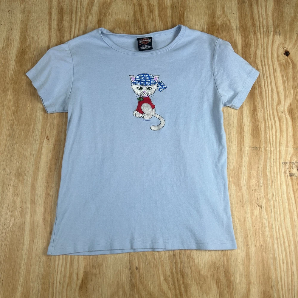 This Y2k Benjy's Harley Davidson T-Shirt is a must-have for any cat lover who loves the open road. The blue, crew neck tee features a cute cat graphic and is made of 100% cotton for easy care and breathability. It's perfect for casual wear or travel and can be worn during all seasons, including summer, fall, and spring. The T-Shirt is a regular fit and comes in women's size 2XL. It has short sleeves and a neckline that's perfect for displaying your favorite accessories. This unit is a single, machine-washable garment that's made in Mexico. Add it to your collection today and show off your love for cats and Harley-Davidson.