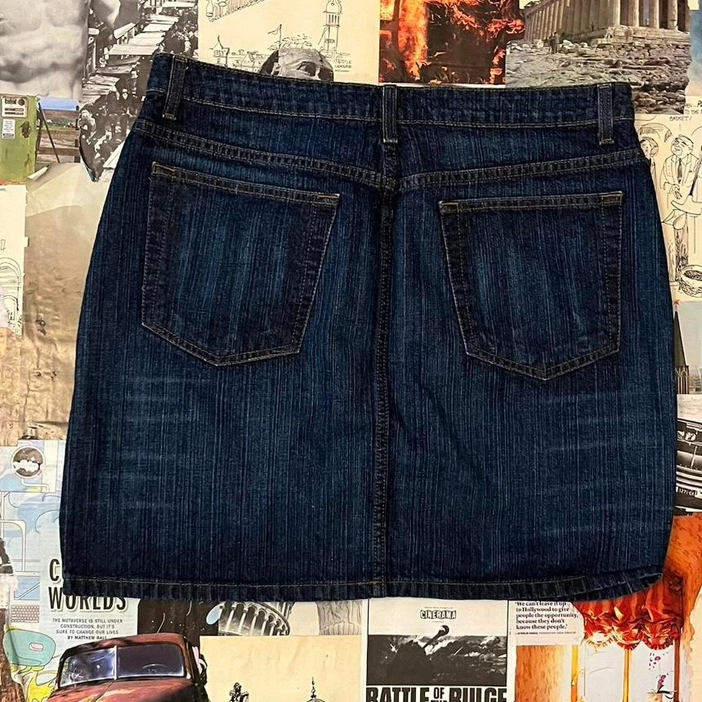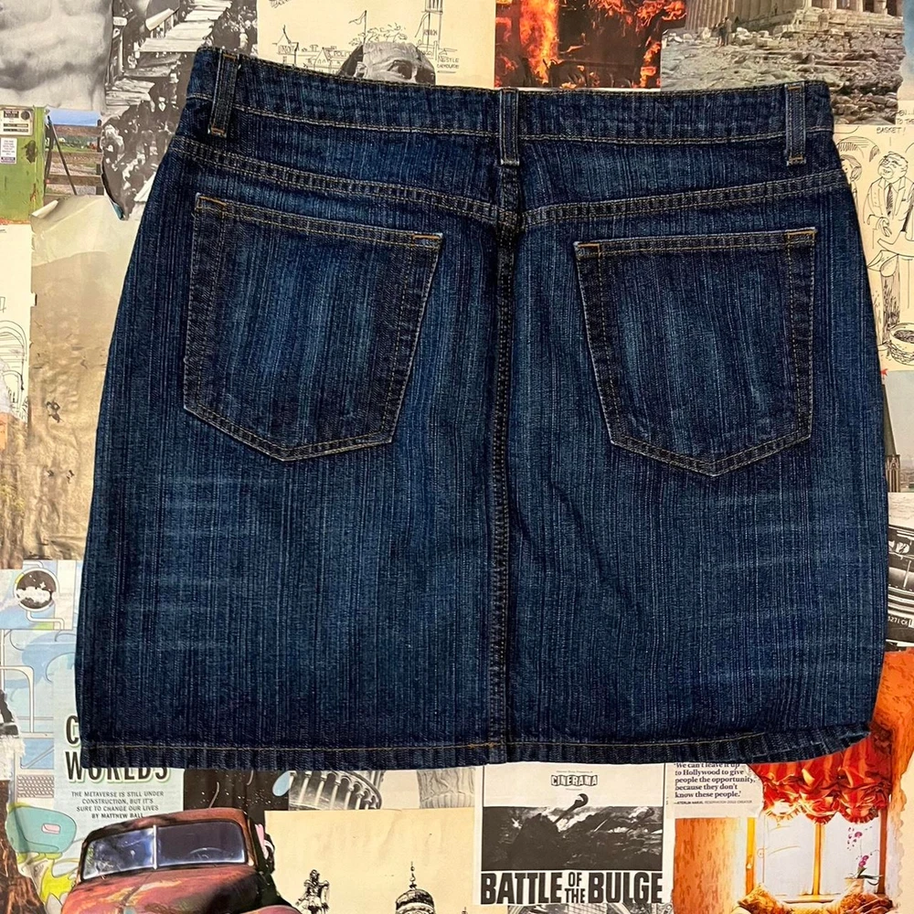 y2k denim mini skirt dark wash color cool 2000s style not stretchy and does not have a bunch of space in the hips y2k 2000s preppy trendy timeless old school fairy core cottage core cottagecore indie alt alternative emo grunge