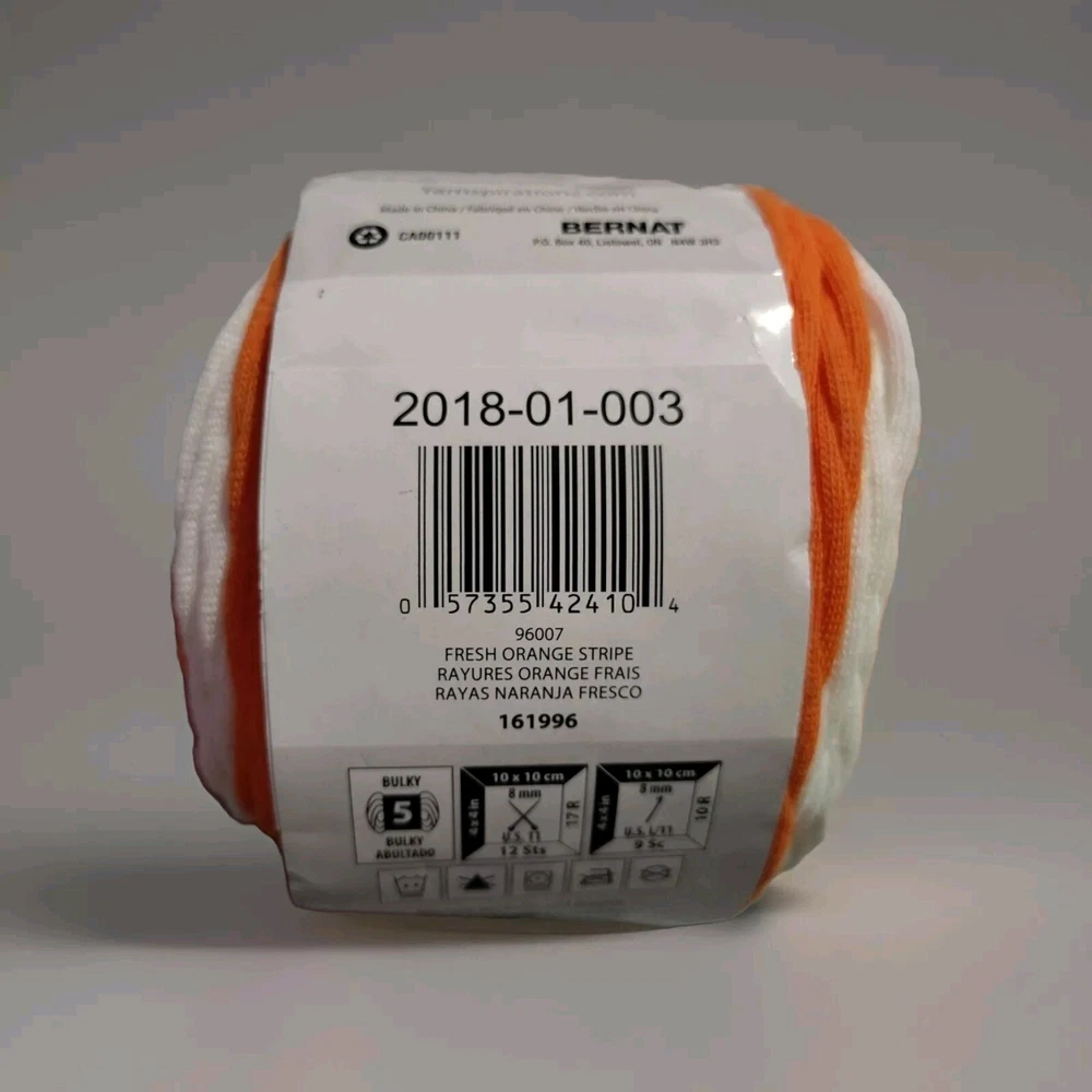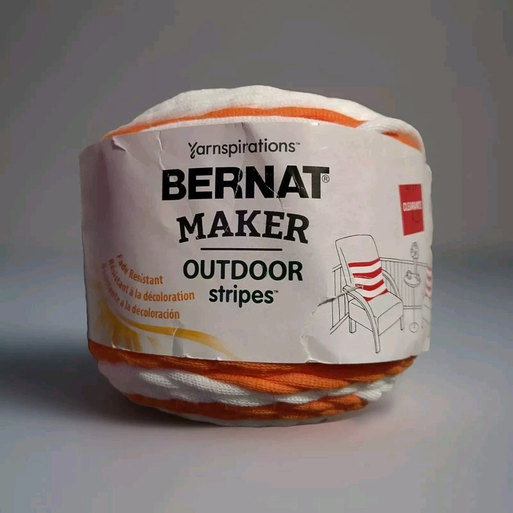 Brand: Bernat Fiber Content: Acrylic/Nylon Color: FRESH ORANGE STRIPE gtin13: 057355424067 MPN: 96003 Type: Striping Style: Self-Striping Model: Yarnspirations Maker Suitable For: Outdoor Accessories UPC: 057355424067 Unit of Sale: Unit Product Line: Bernat Yarnspirations Weight: 5 - Bulky/Craft