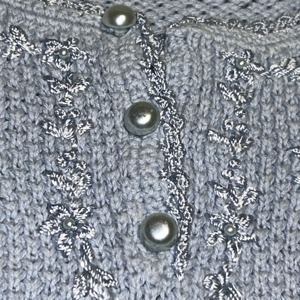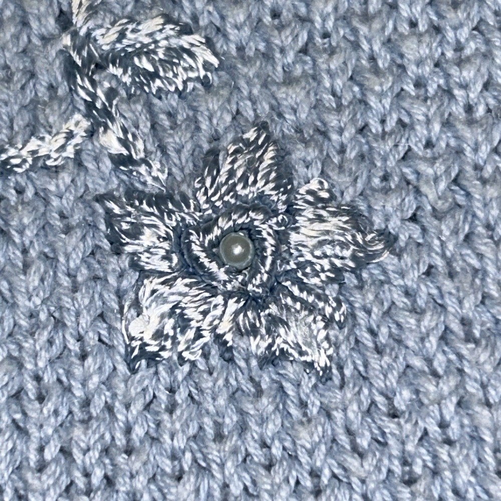 Light blue pullover sweater. Faux pearls. Good condition Measurements Chest armpit to armpit 23.5” Length shoulder to end 20.5” Shoulder seam to seam 19”