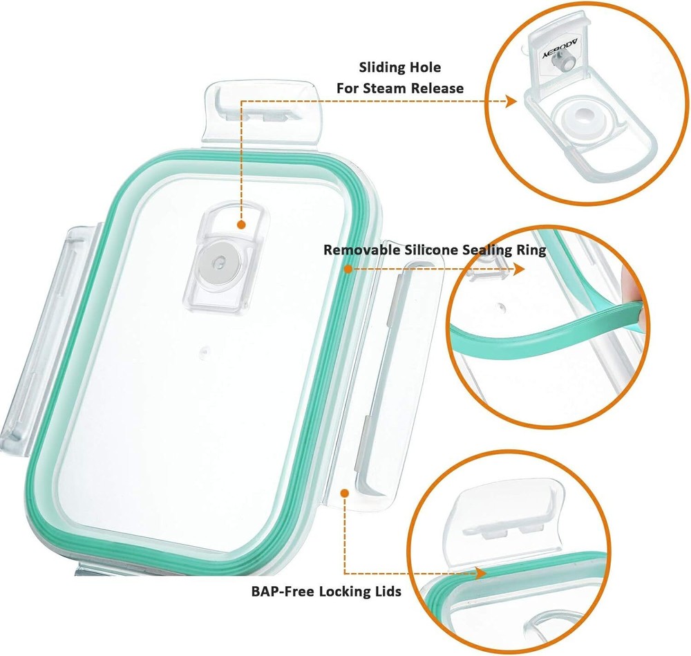 YEBODA Glass Food Storage Containers with Airtight Snap Locking Lids Clear Product Details Product Dimensions: 16.1"L x 7.4"W x 5.5"H Recommended Uses For Product: Meal Prep Special Feature: leak-resistant, airtight Container Shape: Rectangular Closure Type: Snap Is Dishwasher Safe: Yes Material Type Free: BPA Free Item Package Quantity: 1 Item Weight: 6.9 Pounds Product Care Instructions: Oven Safe, Refrigerator Safe, Freezer Safe, Microwave Safe, Dishwasher Safe Item Volume: 640 Milliliters Is Microwaveable: Yes Manufacturer: YEBODA Item Weight: 6.89 pounds Is Discontinued By Manufacturer: No Shape: Rectangular Special Features: leak-resistant, airtight Batteries Included?: No Batteries Required?: No Number of Sets: 6 Brand: YEBODA Color: Clear Material: Silicone, Glass, Plastic, Borosilicate Glass Material Feature: BPA Free Capacity: 1.4 Pounds TOP-QUALITY:Food storage containers made of borosilicate glass. Heat-resistant is up to 750℉(400℃). AIRTIGHT:100% airtight lids built with 4 lock for our containers made with BPA-Free silicone rings. MULTIPURPOSE:Encourage you to take your containers to travel, work, gym, picnics and school lunches. EASY CLEAN:Remind customer not putting lids in oven or microwave, sealing rings are removable-clean.