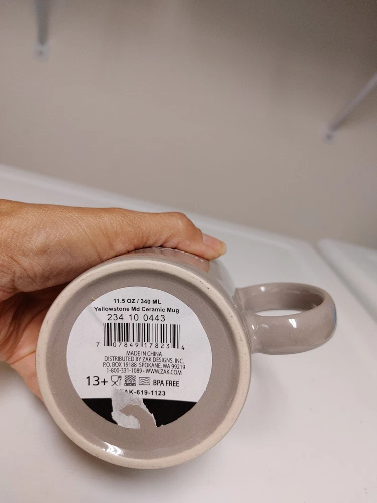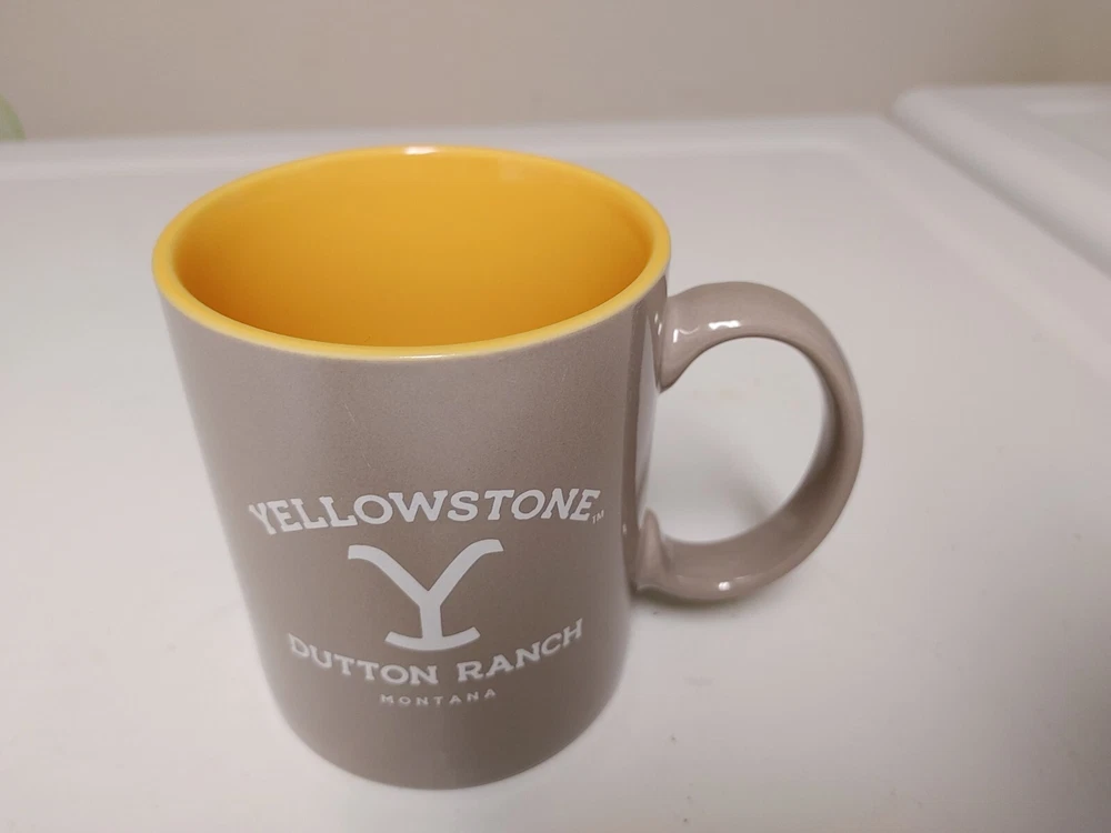 The Yellowstone ceramic coffee mug is a modern-style, round, medium-sized mug that can hold 11.5 oz of hot or cold beverage. It features the logo of the Dutton Ranch and is handmade with ceramic and porcelain materials. The mug is machine washable and has a capacity of 11.5 oz. It is a gray color with yellow accents and is an original, licensed reproduction from the Yellowstone franchise. Perfect for all occasions, this mug is a great addition to any kitchen or collectible display.