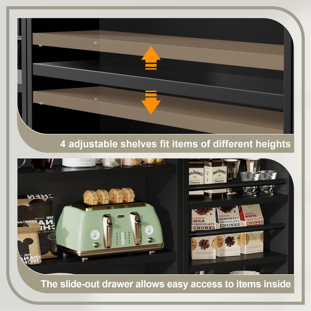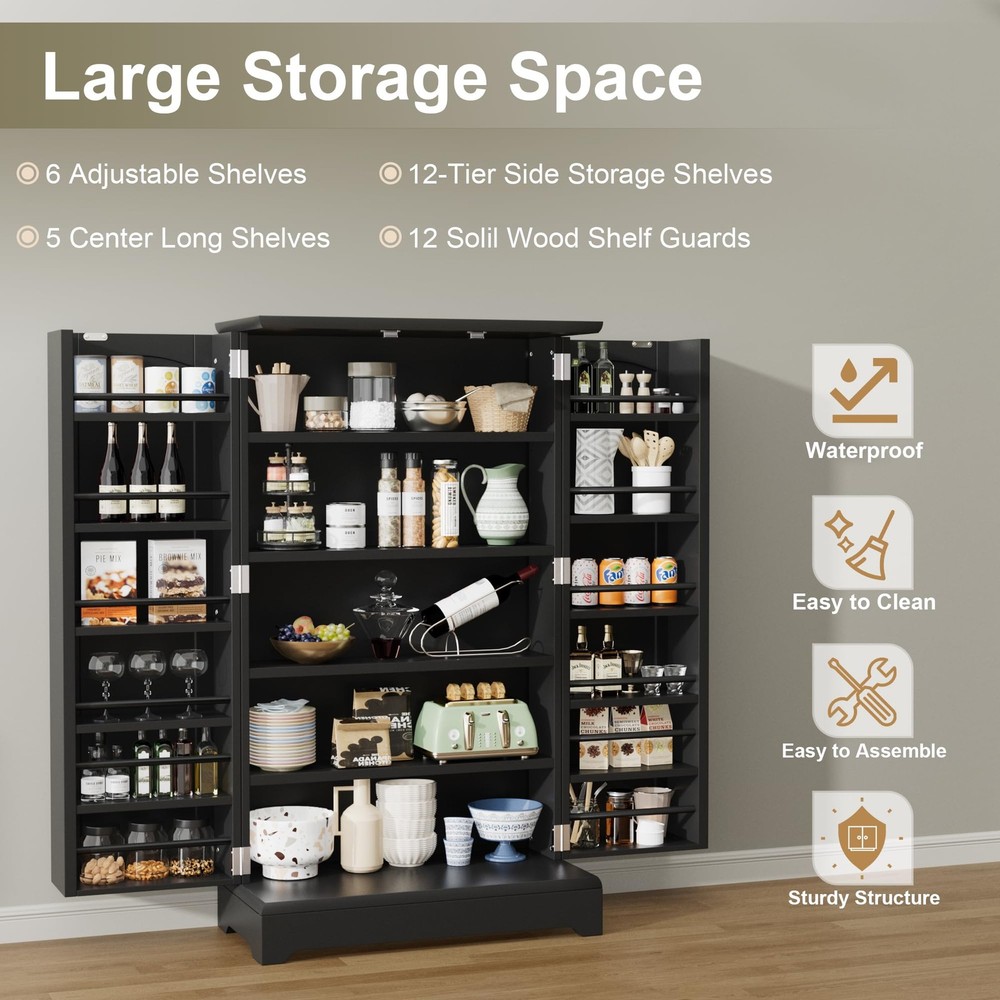 Elegant and Environmentally: Our kitchen storage cabinet combines elegance and practicality.Crafted from premium fiberboard with a black finish.It is worth mentioning that the paint we use is environmentally friendly, so you don't have to worry about toxic or irritating odors. Tailored Organization: 6 adjustable shelves accommodate items of various sizes. Convenient knobs, magnetic door locks and select metal hinges make it easy to open and close the cabinet doors. Versatile Style: This multi-functional cabinet can provide additional storage space in the bedroom, bathroom, kitchen or hallway, etc., beautiful and functional,its clean lines and adaptable design complement various furniture styles. Sturdy Build: Made from MDF, the freestanding cabinet is durable. The wide base ensures stability for safe use. In addition, you can fix the floor cabinet with anti-tipping device to the wall to prevent it from tipping over. Ample Storage: With 5 interior shelves and 12 side shelves, it offers multi-level storage. Frame bars on side shelves prevent toppling.The cabinet's dimensions in 12"D x 24"W x 42"H