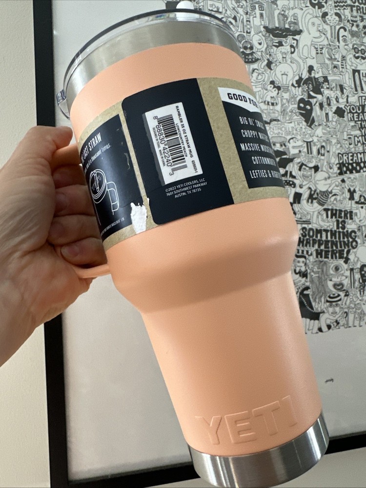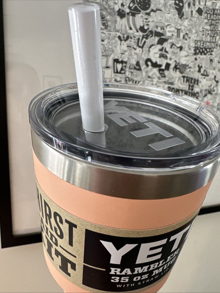 The YETI Rambler 35 oz Lowcountry Peach Color BPA-Free Straw Mug is a three-piece stainless steel straw mug designed to keep your hot or cold beverages at the desired temperature for a long time. The mug features a solid color pattern and a peach-colored lid with a straw access hole. It measures 8.3 inches in height and 5.1 inches in width. The mug is dishwasher safe and comes with a handle, making it easy to carry and clean. The YETI Rambler is a popular brand known for its high-quality insulated mugs and this model is no exception. It is perfect for outdoor adventures, road trips, or just everyday use. MUG HAS A LITTLE TINNY SCRATCH ON THE HANDLE. Please check picture. SOLD AS IS