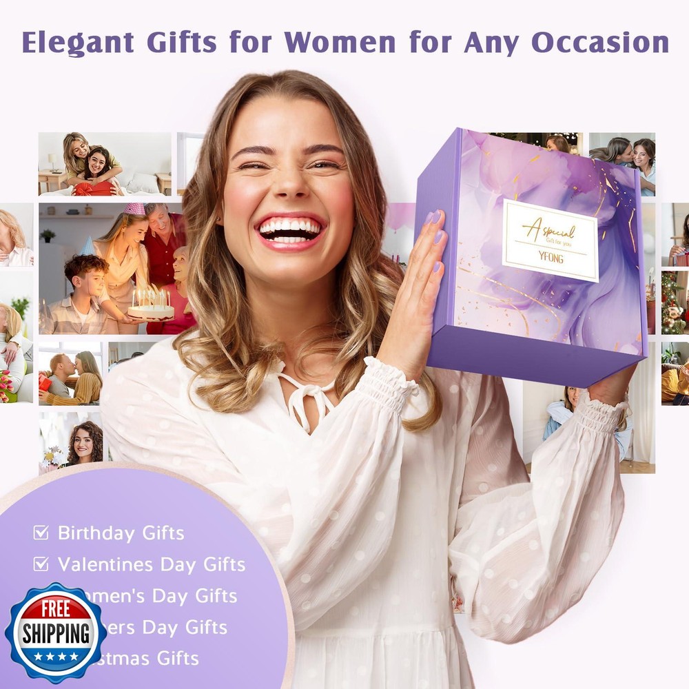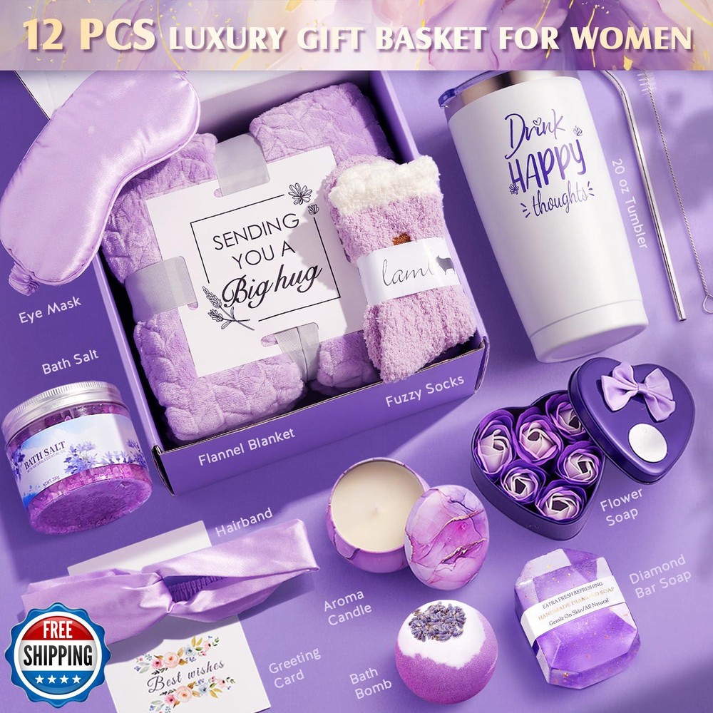 YFONG Spa Gifts for Women, Birthday Gifts for Women, Self Care Get Well Soon Gifts Basket for Mom, Wife, Girlfriend, Sister, Purple Gift Set for Best Friends, Mother's Day, Relaxing Gift - Lavender Features Elegant Birthday Gifts for Women: Still searching for a luxury gift basket that offers an unforgettable unboxing experience? Look no further than YFONG great quality Unique Gifts. Our exquisite gift baskets are perfect for making any woman feel cherished, whether she’s a best friend, mom, sister, daughter, grandma, wife, girlfriend, coworker, or teacher. Ideal for birthdays, care packages, spa sets, thank you gestures, and thoughtful surprises Luxury Care Package: YFONG Get Well Soon Gifts Basket lavender Gifts Set Friendship Gifts is specially designed and curated with love & thought to delight and spoil the special lady in your life, aims to bring her priceless joy and give her a warm hug & love! Perfect as Mothers Day Gifts, Christmas Gifts, Relaxation Gifts, Stress Relief Gifts, Valentine's Day Gifts 12PCS Self Care Gifts:YFONG Gifts Box is a meticulously curated collection designed for ultimate relaxation and comfort. This elegant set includes a luxury flannel blanket, a 20 oz insulated tumbler, a lavender-scented candle, handmade soap, a bath bomb, floral-scented soap, a silk eye mask, a silk headband, fuzzy socks, a gift card, and an exquisite gift box. Each thoughtfully chosen item aims to provide a heart-warming and cozy experience, making it the perfect gift to let her unwind and enjoy some well-deserved leisure time Luxury Plush Flannel Blanket: Our gift basket features a 59*39 inches sumptuous flannel blanket that is extremely soft, cozy, and fluffy, designed to envelop her in ultimate comfort and relaxation. Paired with incredibly soft and comfy fuzzy socks, this set is perfect for keeping her warm and cozy at any time. Send this basket to offer her the warmest love and hugs, ensuring she feels cherished and pampered Insulated Vacuum Tumbler: Crafted from durable 18/8 food-grade stainless steel, this 20 oz insulated tumbler features double-walled vacuum insulation to keep beverages at the perfect temperature. It preserves cold drinks for up to 12 hours and hot drinks for up to 8 hours, making it ideal for iced coffee, tea, wine, juice, champagne, smoothies, sodas, milkshakes, and more. With its secure lid, it’s perfect for enjoying drinks on the go Lavender Scented Relaxing Gifts: The 4 oz lavender scented candle is made of natural wax, can burn smokelessly & evenly for up to 30 hours. Comes with a diamond handmade soap, an exquisite bath bomb, all releasing gorgeous & long-lasting lavender fragrances, that will bring her a luxurious & sublime bubble bath experience, help soothe her mind and relax body Shipping Free & Fast Shipping: We offer free shipping to most of the USA with a normal delivery time of 3-7 days. However, due to the current situation, additional delivery time (up to 3 weeks) may be required for some items. Alternative Carriers: We may use alternative carriers (e.g., USPS, FedEx, UPS) to ensure your package arrives safely and on time. Due to the use of multiple carriers, we are unable to provide a tracking number automatically. Handling Time: Orders are processed and shipped within 1-2 business days of receiving cleared payment. Shipping Restrictions: Shipping to Alaska, Hawaii, Puerto Rico, Guam, and other US territories may incur shipping charges or delivery restrictions. Please contact us before ordering, or your order can be refunded/cancelled. State Restrictions: Certain items may not be shipped to California due to state regulations. Contact for Tracking Updates: If you require tracking updates or have any concerns about the delivery of your order, please feel free to contact us, and we will be happy to assist you. Return Policy 30-Day Hassle-Free Returns: If you are not completely satisfied with your purchase, you can return the item for free within 30 days of receiving it for a full refund or exchange. Easy Return Process: Contact us, and we will provide you with a prepaid return shipping label and detailed instructions. No Restocking Fee: There are no restocking fees for returns. However, the buyer is responsible for return shipping costs if the return is not due to a seller's error. Refund Processing: Refunds will be processed within 1 business day of receiving the returned item in its original condition. Feedback Your feedback is extremely important to us. We strive to provide the best products and customer service possible. If you are satisfied with your purchase, please take a moment to leave us a positive review. If you have any concerns or issues with your order, please contact us before leaving negative feedback. We are committed to resolving any problems and ensuring your satisfaction. Contact Us If you have any questions or concerns, please feel free to reach out to our customer support team. You can contact us through the eBay messaging system. We are available Monday to Friday, 9:00 am to 5:00 pm EST, and we will do our best to respond to your inquiry within 24 hours. Thank you for supporting our small family business!