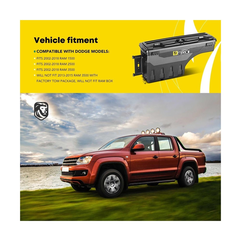 YHTAUTO Set of 2 Truck Bed Storage Tool box Lockable Compatible with 2002-2018 Dodge Ram 1500 2500 3500, Not Fit Rambox, Swing Waterproof Wheel Well Toolbox Description Features: Incredible Fit: Compatible with Dodge Ram 1500/Ram 2500/Ram 3500 2002-2018 truck's driver and passenger side, it is worth noting that does not fit rambox and 2013-2015 Ram 3500 factory tow package; Works with almost any tonneau cover, quick installation with eyelets to easily secure the case to the bed Double Locking for Security: Not sure where to store your equipment? Don't worry, you can lock everything away with YHTAUTO's truck bed toolbox. The innovative lockable case will keep your gear safe, while the bonus unpickable combination password lock offers an extra layer of security. Our dual anti-theft feature protects against any tampering attempts, providing you with peace of mind Unmatched Toughness: The superior quality ABS composite material makes the YHTAUTO truck bed tool box not only durable but also lightweight. It protects your belongings from strong winds, rain and dust, and can even withstand the sun's rays. Don't let the elements ruin your day The Ultimate in Convenience: The swing truck tool boxes mounted on the trucks bed side; Pull the latch and the swing box truck toolboxes pivot nearly 180o over your lowered tailgate, providing instant access. Fold it up when not in use and it doesn't take up any valuable cargo space. No matter how fast you drive, it stays in place Attention: The maximum load our products can reach in a static state is 75 LB, but due to the different road conditions in the process of drive, the actual load capacity of the product is less than 75 LB. We kindly recommend that you save some weight when loading the tools, so as to avoid damage, and prolong the product's service life Product Details: Brand: YHTAUTO Color: black Material: Acrylonitrile Butadiene Styrene Special Feature: lockable Style: Modern Brand: YHTAUTO Color: black Material: Acrylonitrile Butadiene Styrene Special Feature: lockable Style: Modern Recommended Uses For Product: Tools Water Resistance Level: Waterproof Opening Mechanism: Latch Shape: Rectangular Pattern: Solid Number of Items: 2 Number of Compartments: 2 Unit Count: 1 Count Item Package Quantity: 2 Material Feature: Durable, lightweight, and weather-resistant Maximum Weight Recommendation: 75 Pounds Closure Type: Latch Manufacturer: YTAUTOPARTS Item Weight: 40.8 pounds Package Dimensions: 36.65 x 20.55 x 17 inches Manufacturer Part Number: YHTPTB10006 OEM Part Number: 5-SBSC-DR02-L, 5SBSCDR02L, SC300D, 5-SBSC-DR02-R, 5SBSC-DR02R, SC300P Special Features: lockable Date First Available: July 31, 2019 Delivery We Do Not Ship Outside of the Continental US. Return Policy All items qualify for returns within 30 days of receipt. Buyer is responsible for return shipping on any item that is not damaged. Feedback We take our reputation seriously, we buy and sell online, so we understand the value of trust. If you are unsatisfied with your order, please contact us and we will work with you to resolve it to your satisfaction.