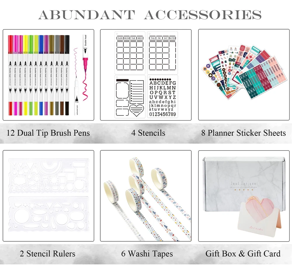 【Bullet Dotted Journal Set with Abundant Accessories】All-in-one planner notebook set with 1 A5 hardcover bullet dotted journal notebook, 12 dual tip colored pens, 8 planner sticker sheets, 4 reusable journal stencil sheets, 5 washi tapes, 2 stencil rulers, 1 gift card, 1 gift box. With this ultimate journaling set, you can design the journal of your dreams in no time! 【Premium 120GSM Thick Paper Dot Journal Notebook】This A5 journal (5.7in*8.3in*0.9in) features a vegan leather cover, 200 pages, 120GSM acid-free thick off-white paper, NO BLEED. Each page contains 925 dotted grids with X25 * Y37 dots, 5mm spacing and medium visibility. The lay-flat design is comfortable for writing and drawing, with round corners, pen holder, elastic band, 2 ribbon bookmarks and expandable inner pocket for storing important things. 【12 Dual Tip Colored Pens】These 12 dual tip colored pens are water-based and non-toxic, safe for kids. Dual tip design will add more journaling fun, the 0.4 mm fine tip for precise highlighting and details, and the flexible 1 - 2 mm brush tip for easy coloring and blending. Easy-to-hold and write smoothly, work very well, perfect for bujo journal writing and drawing. 【Amazing Stencils, Stickers and Washi Tapes】This dot journal kit contains a variety of journaling supplies, incl. 8 planner sticker sheets, 4 durable journal stencil sheets, 2 practical stencil rulers and 5 decorative washi tapes. They are especially designed to help you quickly layout your pages, and easily make your journal pages into beautiful yet functional layouts, great for daily organizing and journaling. 【Versatile Use】This dotted journal starter kit is thoughtfully designed with love and care, perfect for beginners and journal lovers. You can use these journal kits to organize your daily to-dos, track your habits, plan your goals, and express your creativity! Moreover, the bullet dotted journal kit with gift box and gift card would be a great gift for your family and friends.