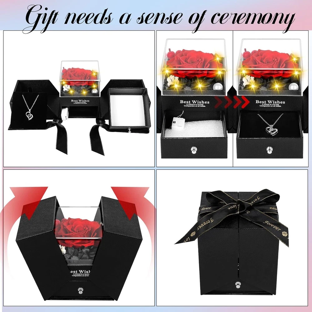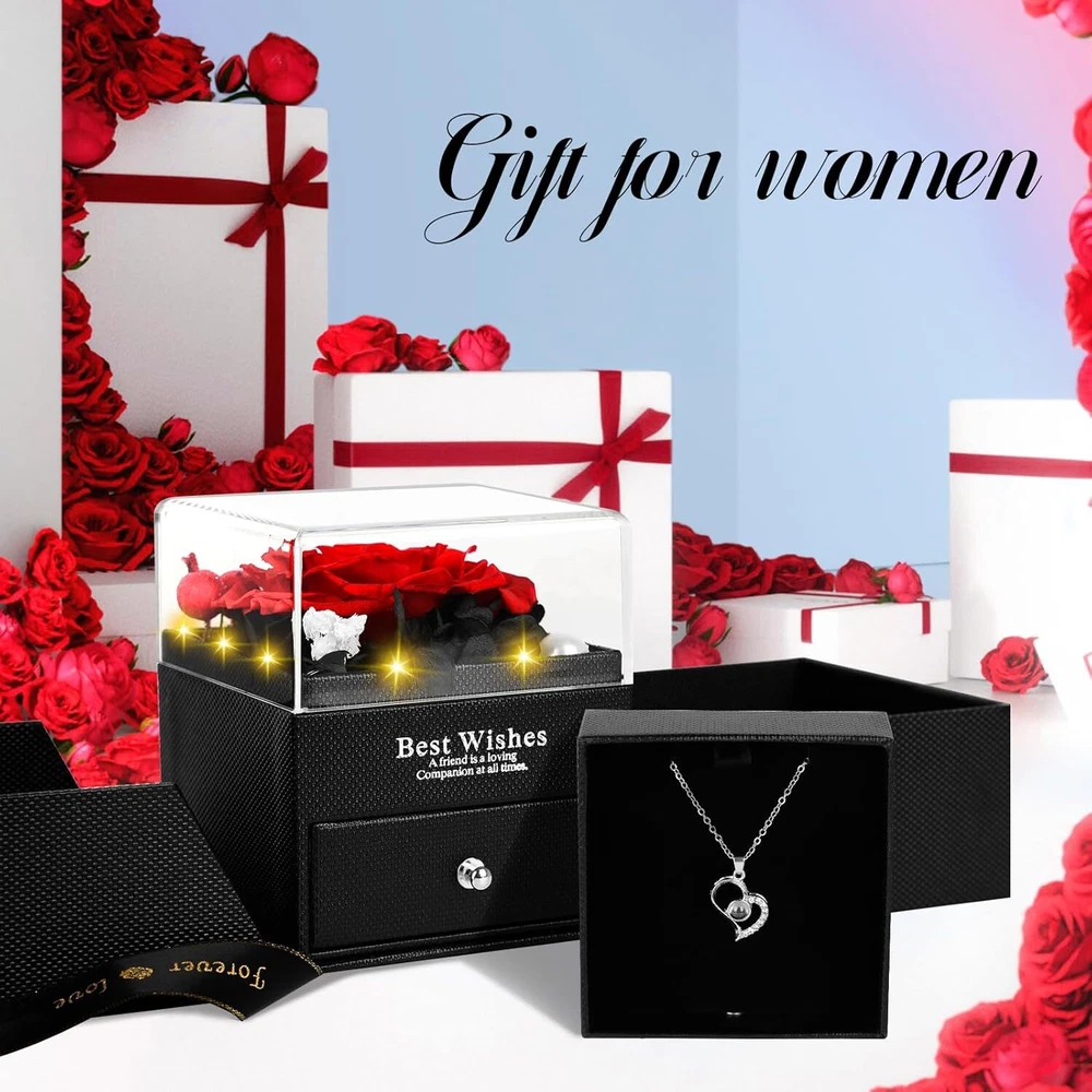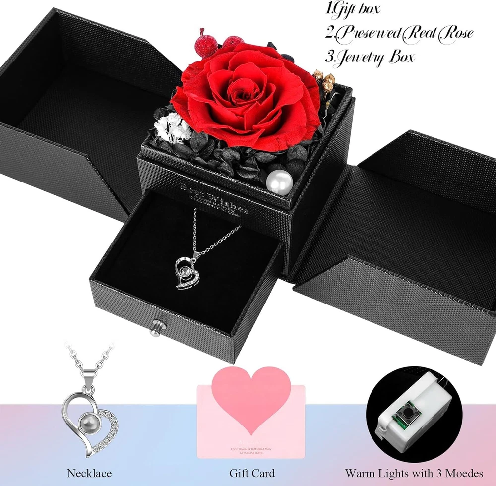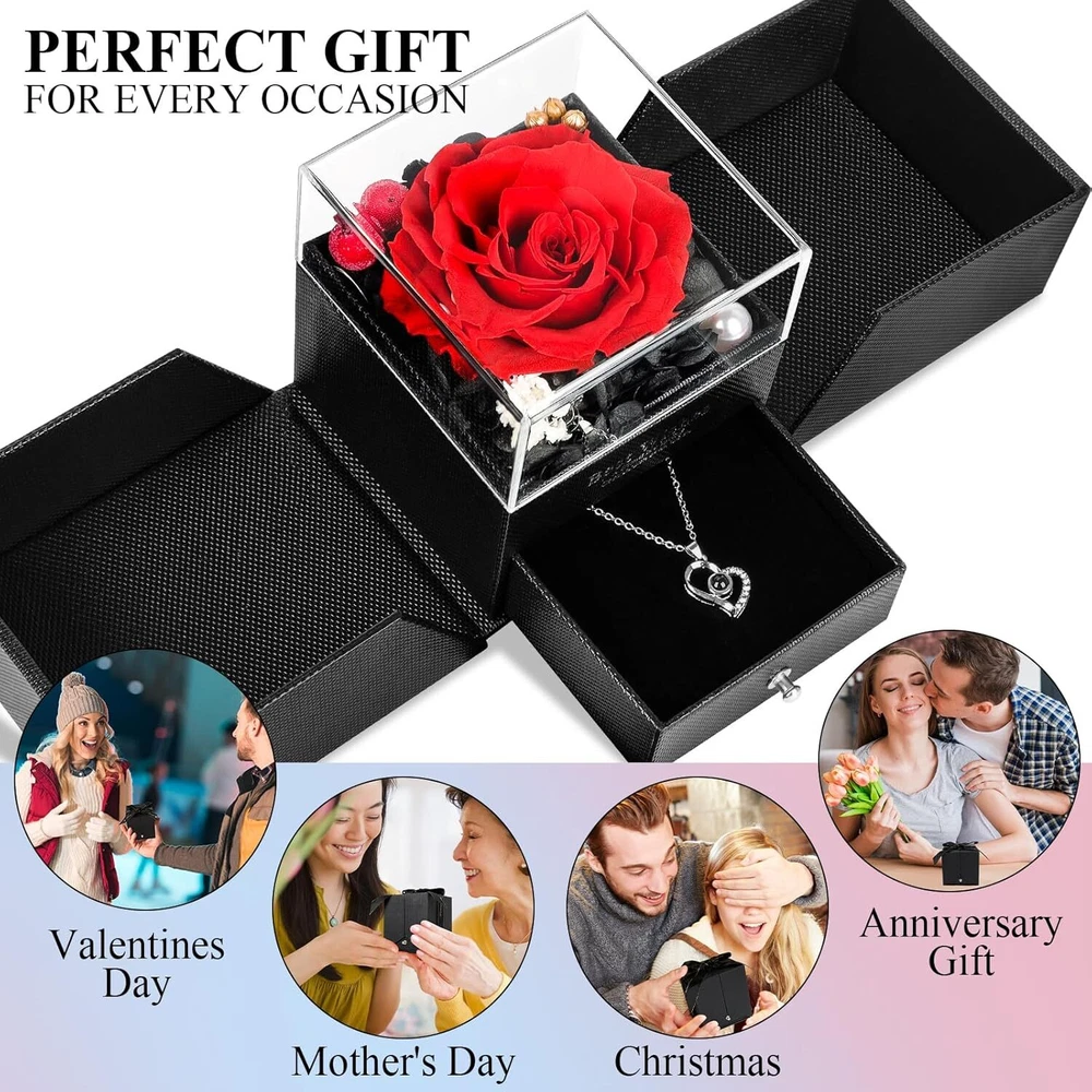 YIMISHCZ Preserved Real Rose box with I Love You Necklace Birthday Gifts RED Product Details Package Dimensions: 5.51 x 5.39 x 4.96 inches Item Weight: 0.317 ounces Manufacturer: YIMICZSH Item model number: Preserved Red Real Rose Flowers Batteries: 1 Lithium Ion batteries required. (included) Brand: YIMISHCZ Plant or Animal Product Type: Rose Color: RED Number of Items: 1 Occasion: Mother's Day, Engagement, Christmas, Birthday, Valentine's Day [You will receive] finely crafted rose necklace set, featuring a necklace with "I LOVE YOU" in 100 languages, Preserved flowers rose gift box with light-up LED strip, pearls, and a greeting card for you to personalize. [Preserved Real Rose] This is a uniquely designed and adorable gift, symbolizing unique love. The eternal rose never withers, representing everlasting love. It is the perfect gift for mothers, family, wife and girlfriends. The eternal rose can be preserved for 3-5 years without the need for watering and management. [The "100 Languages to Say] I Love You" necklace is an ideal present for mothers, grandmothers, girlfriends, and wives. As a luxurious and delicate item, it also serves as a storage compartment for other jewelry or rings. [Give her gift] Lovely gift for wife, mom girlfriend, daughter, grandmother, sisters, suitable for Valentine's Day, Mother's Day, Christmas, Thanksgiving, wedding, anniversary, birthday or other female festivals. [How to Say "I Love You" in 100 Languages] In a well-lit environment, hold the stone in the center of the necklace close to your eyes. Alternatively, go to a dark area with little to no light and turn on the camera function on your phone, aiming the camera at the stone. You will see 100 languages on the screen.