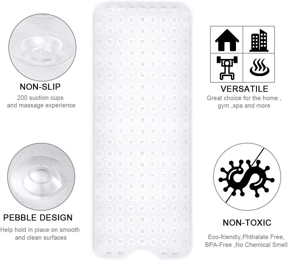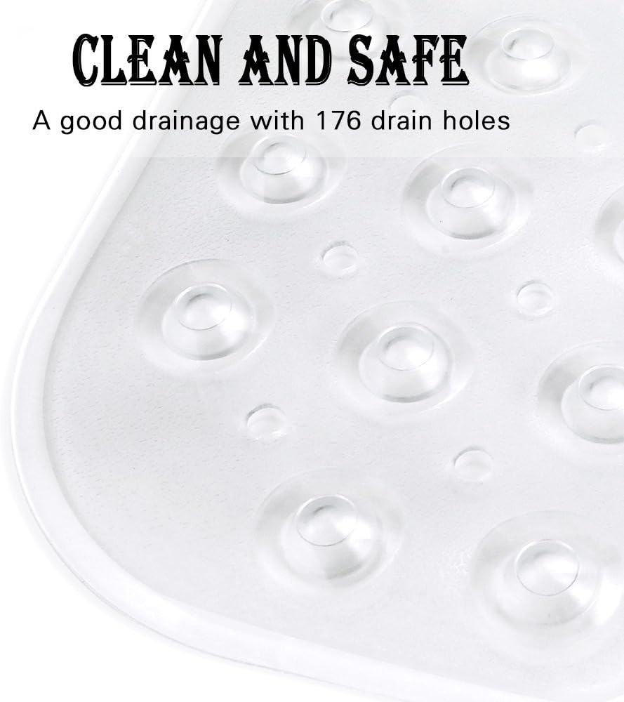 YINENN Bath and Shower Safety Mats 40x16 inch, 40" x 16" (Rectangular), Clear Description Features: Vinyl Extra large bath shower safety mats: No chemical smell, vinyl quality material. Heavy duty and standard dimensions and rectangle's shape makes it lays flat in any smooth bath floors. Non-slip shower mats with hundreds of suction cups: YINENN anti-slip bath mats features 200 suction cups that help hold in place on smooth surfaces. Powerful suction cups offer 360 degree safety protection for users. YINENN shower safety mat is a great choice for the home, gym, spa and more! Multifunctional and utility: looks like pebble design, provide massage experience in shower time as it comes with 200 suction cups, featuring necessary anti-slip function, meanwhile YINENN extra large mat is 40 inch x 16 inch which provides excellent coverage and also features small holes throughout to allow water to circulate. Machine washable: YINENN bath mat consists of 176 drain holes, machine washable to facilitate hassle-free maintenance. To clean at any time, simply toss the mat into the machine and enjoy its fresh appearance. Air dry for years of safe, healthy, hassle-free to use. Warning: YINENN bath shower safety mat only attach to smooth and clean surface. Don't for use on textured, tiled, or non-smooth surfaces. Do not use bath oils in case of slipping.It's recommend to allow the mat to air out in a well ventilated area for 24 hours before use if you encounter a strong odor when the package is first opened. Product Details: Material: Vinyl Color: Clear Size: 40" x 16" (Rectangular) Brand: YINENN Item Weight: 730 Grams Shape: Rectangular Product Dimensions: 40"L x 16"W Manufacturer: YINENN Item Weight: 1.61 pounds Country of Origin: China Item model number: clear-mat Is Discontinued By Manufacturer: No Fabric Type: Vinyl Batteries required: No Handling We will ship all orders within 3 business day of payment. Delivery We Do Not Ship Outside of the Continental US. Return Policy All items qualify for returns within 30 days of receipt. Buyer is responsible for return shipping on any item that is not damaged. Feedback We take our reputation seriously, we buy and sell online, so we understand the value of trust. If you are unsatisfied with your order, please contact us and we will work with you to resolve it to your satisfaction.