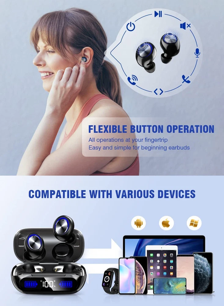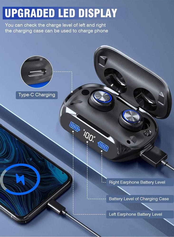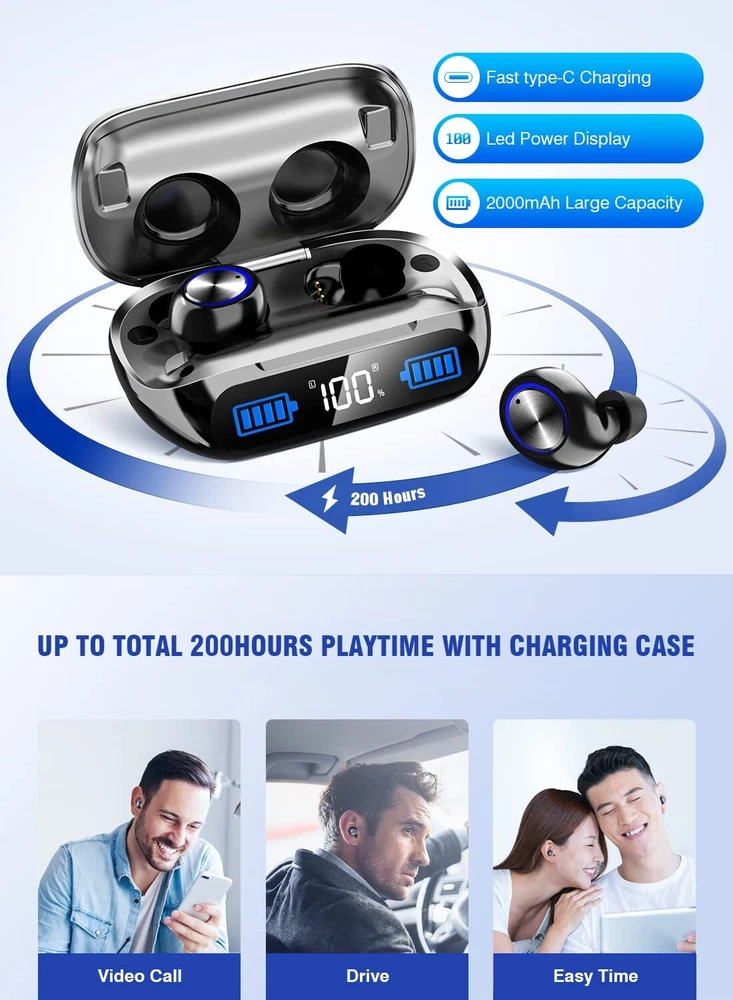 【200 hours of ultra-long continuous operation & high-end LED battery remaining display】With our independently developed innovative power-saving technology and high-performance battery, our Wireless Earbuds Bluetooth can be played continuously for about 6-7 hours or more on a single charge. Plus, it comes with an integrated 2000mAh charging and storage case, allowing you to enjoy up to 200 hours of music playback. The high-end LED battery remaining display keeps you informed about the battery status, ensuring you never run out of power. 【Quick Charging: Our Wireless Earbuds Bluetooth are equipped with the best TypeC fast charging cable on the market. With a transmission speed about 2 times faster than traditional Micro USB, you can fully charge the earbuds in about 1 hour. Enjoy uninterrupted listening experiences without long waiting times. 【Bluetooth5.3 technology stable connection and instant pairing】Thanks to our advanced Bluetooth5.3 chip, our Wireless Earbuds Bluetooth offer improved battery life and connection stability. Experience a stable connection with low power consumption, low latency, and faster transmission speed. Achieve a delay rate close to "zero" for seamless audio and video synchronization. After the initial setup, the earbuds will automatically connect to your device whenever you take them out of the charging box, making it easy even for beginners to use. 【CVC8.0 Noise Cancelling and HiFi Stereo Sound Effect】 Our built-in microphone adopts advanced CVC8.0 noise cancelling technology, reducing environmental noise and echo for crystal-clear voice calls. Enjoy immersive sound quality during calls and music playback with our high-quality audio chips, preserving the original sound of the music and delivering clear high-fidelity and powerful bass stereo sound. 【IP7 Waterproof, Wide Compatibility, In-ear design for Europeans and Americans】Our Wireless Earbuds Bluetooth feature a built-in nano waterproof coating and a 7-level waterproof design, providing protection against water damage. They are perfect for various outdoor activities such as running, hiking, and jogging, even on rainy days. These earbuds are compatible with most Bluetooth-enabled devices like mobile phones, tablets, laptops, and computers. 【suitable for both left and right ears, 16.1 grams ultra-light】Designed with Europeans and Americans in mind, they offer a comfortable in-ear fit and weigh only 16.1 grams, ensuring long-lasting comfort and reducing ear fatigue. The included ear hooks made of rubber material provide excellent softness and secure fit, ensuring they stay in place during any activity.