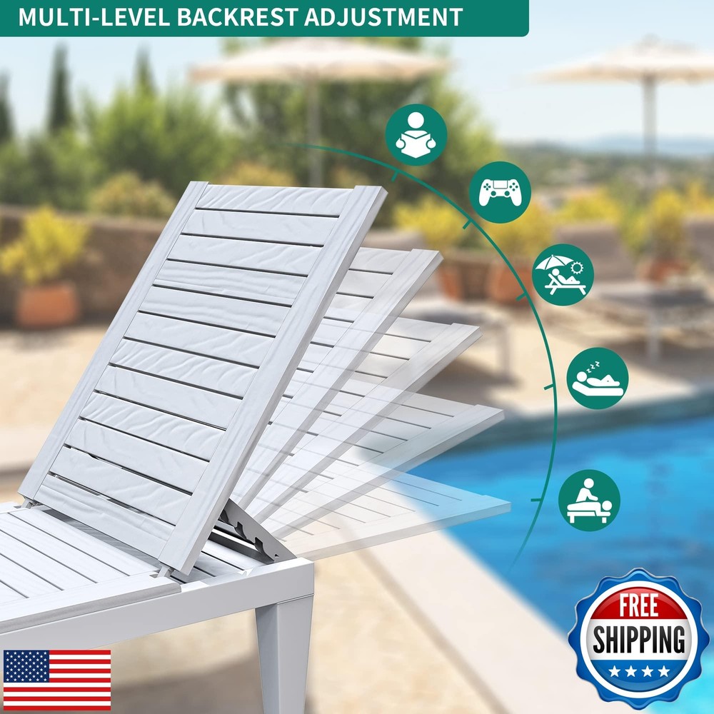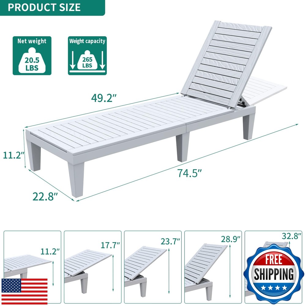 YITAHOME Chaise Outdoor Lounge Chair with Adjustable Backrest, Multi-Functional Patio Loungers Easy Assembly and Lightweight, Waterproof Poolside Chaise Lounge with 265lbs Capacity, Grayish-White Features Adjustable Backrest: Backrest features 5 different adjustable positions so you can always find the optimal cozy position for napping/gaming/spa/reading; A great addition to your patio that will take your summer relaxation to the next level (Cushions sold separately) Reliable Materials: Made from polypropylene resin and constructed with an appealing wooden grain look; Provides a strong base that will not bend; Built to last and UV-resistant to prevent fading; Designed with no screws or bolts so your patio won’t suffer any rust stains; Features better all-season protection compared to wood and metal Minimal Assembly: No major tools or skills required; This lounger is easy to assemble within 5 minutes; Features a built-in locking setup to ensure that the top doesn’t slip off Waterproof Functionality:Even if it is rained on, the lounger will not rust and you don’t have to seal it every year; Works as a casual poolside lounger or tanning bed Lightweight: Weighs only 20.5lbs. so you can easily carry it with you wherever you need; Sturdy structure can support a person weighing up to 265lbs Shipping Free & Fast Shipping: We offer free shipping to most of the USA with a normal delivery time of 3-7 days. However, due to the current situation, additional delivery time (up to 3 weeks) may be required for some items. Alternative Carriers: We may use alternative carriers (e.g., USPS, FedEx, UPS) to ensure your package arrives safely and on time. Due to the use of multiple carriers, we are unable to provide a tracking number automatically. Handling Time: Orders are processed and shipped within 1-2 business days of receiving cleared payment. Shipping Restrictions: Shipping to Alaska, Hawaii, Puerto Rico, Guam, and other US territories may incur shipping charges or delivery restrictions. Please contact us before ordering, or your order can be refunded/cancelled. State Restrictions: Certain items may not be shipped to California due to state regulations. Contact for Tracking Updates: If you require tracking updates or have any concerns about the delivery of your order, please feel free to contact us, and we will be happy to assist you. Return Policy 30-Day Hassle-Free Returns: If you are not completely satisfied with your purchase, you can return the item for free within 30 days of receiving it for a full refund or exchange. Easy Return Process: Contact us, and we will provide you with a prepaid return shipping label and detailed instructions. No Restocking Fee: There are no restocking fees for returns. However, the buyer is responsible for return shipping costs if the return is not due to a seller's error. Refund Processing: Refunds will be processed within 1 business day of receiving the returned item in its original condition. Payment We accept all major credit cards, PayPal, and Apple Pay for your convenience. Your payment information is secure and encrypted to ensure a safe and seamless transaction. Please complete your payment within 3 days of purchase to avoid any delays in shipping. Feedback Your feedback is extremely important to us. We strive to provide the best products and customer service possible. If you are satisfied with your purchase, please take a moment to leave us a positive review. If you have any concerns or issues with your order, please contact us before leaving negative feedback. We are committed to resolving any problems and ensuring your satisfaction. Contact Us If you have any questions or concerns, please feel free to reach out to our customer support team. You can contact us through the eBay messaging system. We are available Monday to Friday, 9:00 am to 5:00 pm EST, and we will do our best to respond to your inquiry within 24 hours. Thank you for supporting our small family business!