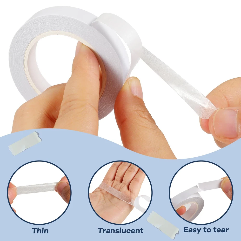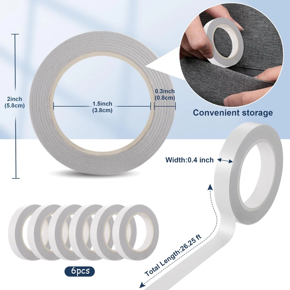 PRODUCT DETAILS Quantity: 6pcs Color: White Product material: PTFE Gross weight: 3.73oz Net weight: 3.13 oz Product size: 7.08 x 4.7 x 0.47in Package size: 7.08x 4.7 x 0.47 in This craft tape is a double stick tape, Made of high-quality thin paper and strong adhesive. thin double sided tape, strong double sided tape, it has strong viscosity and can easily fix two objects together. Double side tape for crafts can be easily teared by hand. The service life is longer than ordinary tape. Heat resistant, glue is not easily lost in hot weather. This double-sided tape for crafts has a wide range of applications, Double sided tape can be widely used in family life and school. Double sided adhesive tape for crafts, scrapbooks, boxes, ribbons, documents, origami, decorations, stamps, wallpapers, paper, card making, gifts and gift box packaging. This white double-sided tape is an essential glue tape for DIY. This strong double sided tape can be applied to most surfaces, such as wood, paper, fabrics, glass, metal, paint, PVC, marble, clothing, fabrics, walls, and plastics, making it very suitable for bonding various similar and different materials together. It is a double-sided tape with a wide range of uses. You will receive 6 rolls of white strong double-sided tape, scrapbook tape, 2/5 inches X26.25 feet, long enough to meet your adhesive and work process needs, easy to use, and can easily tear off double-sided tape by hand without the need for scissors. After removal, there will be no sticky residue left. For better adhesion, please keep the surface of the object clean and smooth before applying double-sided tape, the glue tape can be completed.