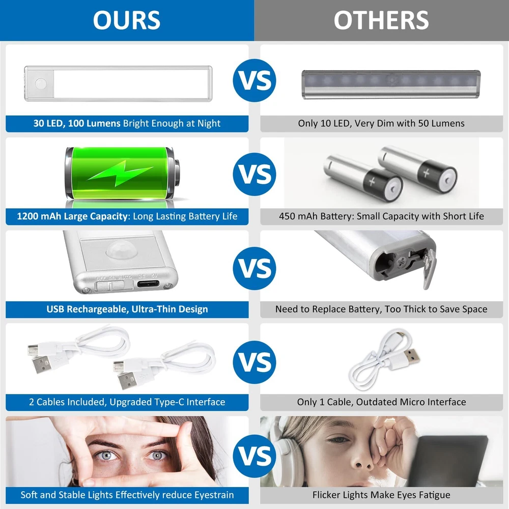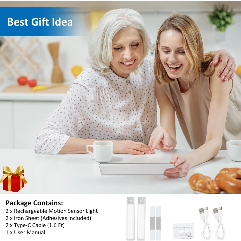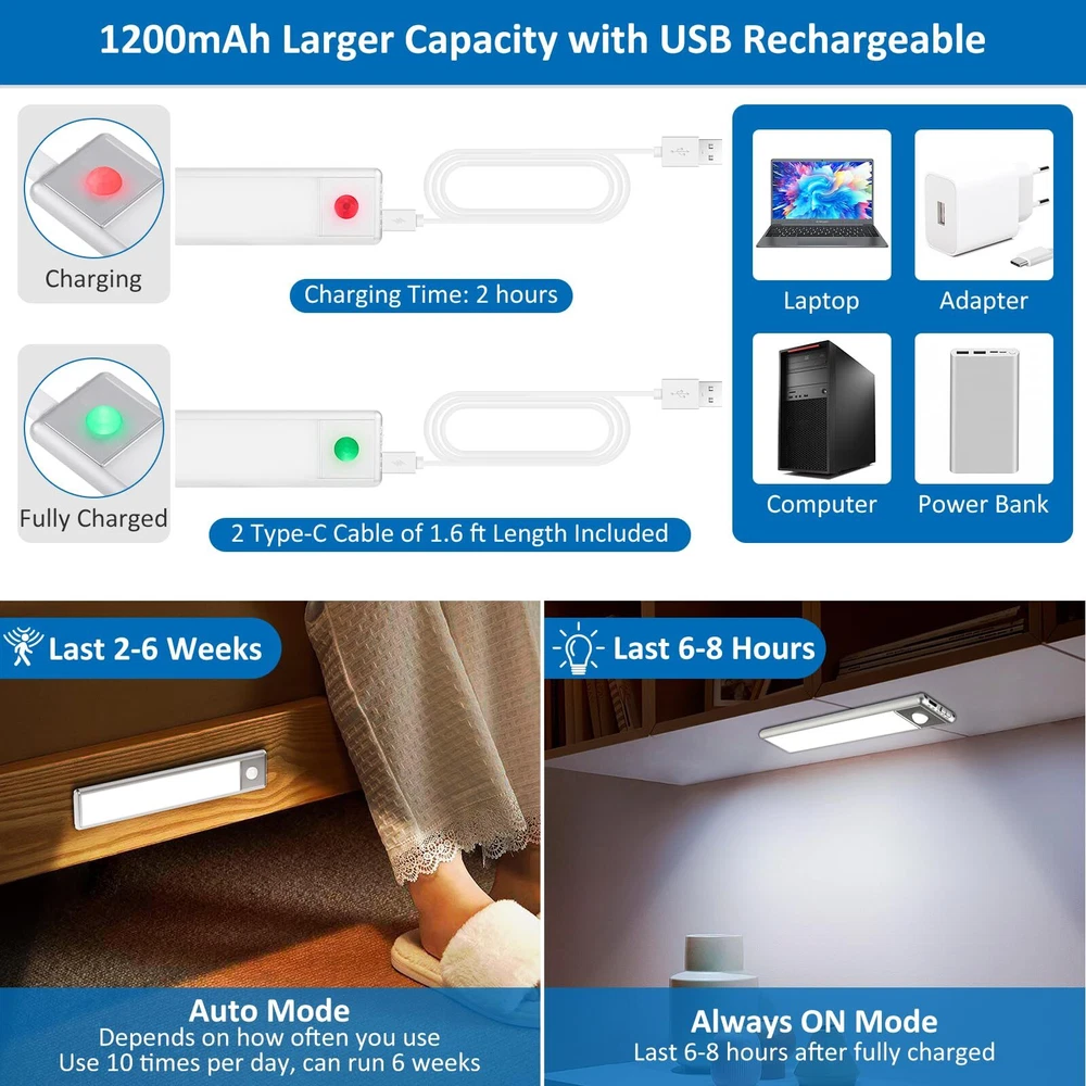 Tips: 1. Motion sensor mode can't be used during the day. Light up on motion detection ONLY in low ambient light. 2. The magnetic force on the stainless steel surface is not sufficient. You will need to use the provided metal strip for installation. 3. Please note that the input voltage of this product is DC 5V, please make sure the charger you use supports DC 5V output, otherwise the product cannot be charged. Upgraded Motion Sensor: When use AUTO mode, Our motion sensor light indoor can auto-on within the detection area (Range: 10ft, Angle: 120°), auto-off after 20 seconds of no motion detected, helps prolong working time. The PIR motion sensor can only be activated in dark environment. When use ON mode, this under cabinet lights rechargeable can be kept on, you can also use it for camping or blackout (instead of flashlight). 3 Switch Modes: Auto/ On /Off Easy Installation & Multiple Uses: Built-in magnet, you can stick the led closet light motion activated to ironwork surface directly or via metal strip with non-marking tape; neither way will damage your precious furniture. Easy to install and remove it to charge. Ideal for closet, stairs, cabinet, wardrobe, bedside, drawers, cupboard, bookcase. When necessary, take the under cabinet lights wireless down for illumination at any time 30 LEDs, 100lm, Eyes-Care: The closet lights motion sensored contains 30 LEDs, up to 100 lumens output. Offer you a gentle 6500K cool white light, bright enough to make sure you never stumble in the dark. Perfect to many space, like living room, bedroom, kitchen, washroom, car, garage, pantry, entrance, hallway, laundry room, baby rooms, attics USB Rechargeable: Built-in 1200 mAh high-capacity rechargeable battery, USB-C port can be easily fully charged in just 2 hours. After fully charged, these rechargeable under cabinet lighting last for 6 hours in ON mode and last up to 6 weeks in AUTO mode (Use 10 times per day) Charge occasionally but benefit daily