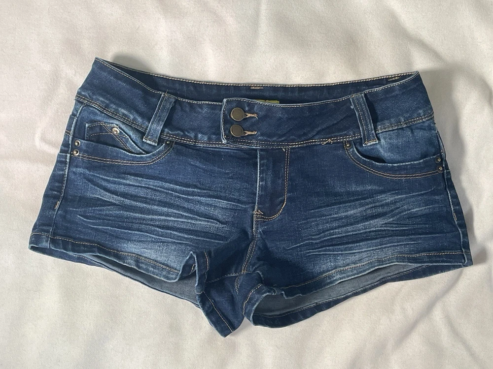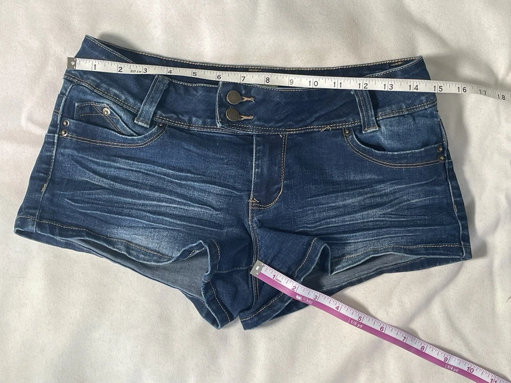 YMI WannaBettaButt Double Button Extended Tab Denim Shorts Size 5 Low Rise Micro Measurements in photos 75% Cotton, 23% Polyester, 2% Spandex Care instructions Machine Wash Origin Imported Closure type Zipper About this item Five pocket short Double button and zip fly Back non flap pockets Extend tab closure Butt lifting and shifting seams From the wannabettabutt line, this double button extend tab shorty short is awesome for any warm day. Pair with wedges or sandals. #lowrise #ymi #wannabettabutt #buttlifting #y2k