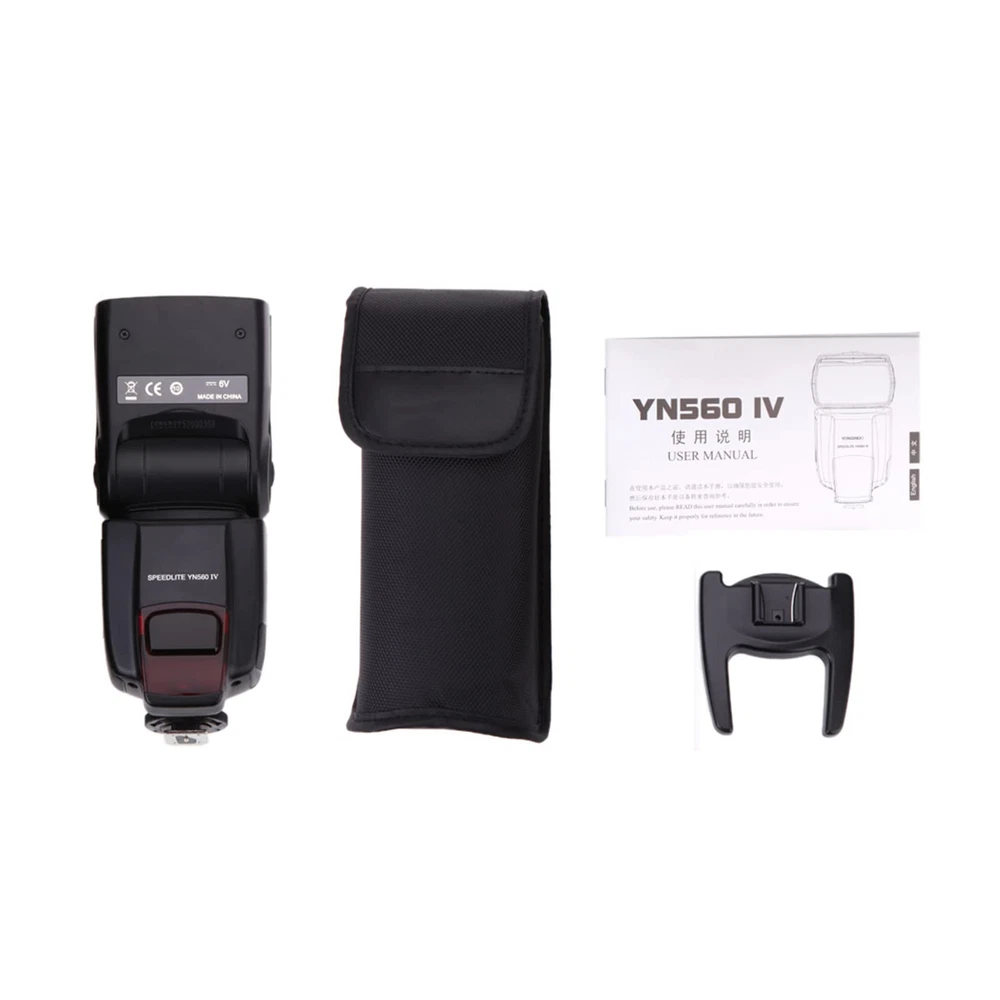 Specifications: Circuit design: Insulated Gate Bipolar Transistor (IGBT) Guide No.: 58 (ISO 100, 105mm) Flash mode: M, Multi Triggering mode: Camera set-up,TX, RX, S1, S2 Zoom range: 24, 28, 35, 50, 70, 80, 105mm Vertical rotation angle: -7~90 degrees Horizontal rotation angle: 0~270 degrees Power supply: 4* AA size batteries (not included) Lighting times: 100~1500 times (AA alkaline cell used) Recycle time: approx. 3s (AA alkaline cell used) Color temperature: 5600k Flash time: 1/200s~1/20000s Flash control: 8 levels of output control (1/128~1/1), 29 levels of fine tuning External interface: hot shoe, PC port and external charging port Wireless triggering distance: 20~25m indoor, 10~15m outdoor, 100m(2.4G wireless) Additional features: The electronic flash head zooming, sound prompt, PC prot, power saving mode, overheating protection and auto save settings Item size: 20 * 7 * 5.5cm / 7.9 * 3.0 * 2.2in Item weight: 366g / 12.9oz Package size: 21 * 10 * 8.5cm / 8.3 * 3.9 * 3.3in Package weight: 541g / 1.19Lbs Package List: 1 * Speedlite 1 * Mini Stand 1 * Protecting Bag 1 * User Manual(Chinese & English) Supports Wireless Master Function,provides 3 independent groups with controlling ability, realizing remote control the flash mode, flash output and focal length of the YN560 IV and YN560 III. Supports Wireless Slave Function, fully supports YN560-TX, RF-603 II RF-602 Wireless Transmitter.(YN560 IV=YN560III+YN560-TX) Supports Multiple Trigger Synchronous Mode. Top of the camera, 2.4G wireless triggering, S1 and S2 pre flash cancel mode. Supports setting save automatically, custom settings. Verify the flash light setting Support 24~105mm electric zooming function, ultrafast charging recycle system, supports external power supply.