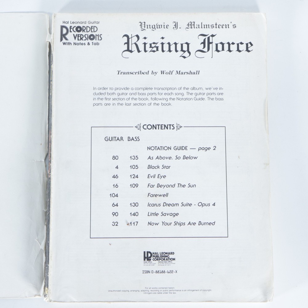 YNGWIE MALMSTEEN GUITAR & BASS TAB / GUITAR & BASS TABLATURE / RISING FORCE. The front cover isn't attached. All items come from a smoke free home. If you have any questions please ask and I will get back to you immediately. Thank for looking and please check out my other listings.