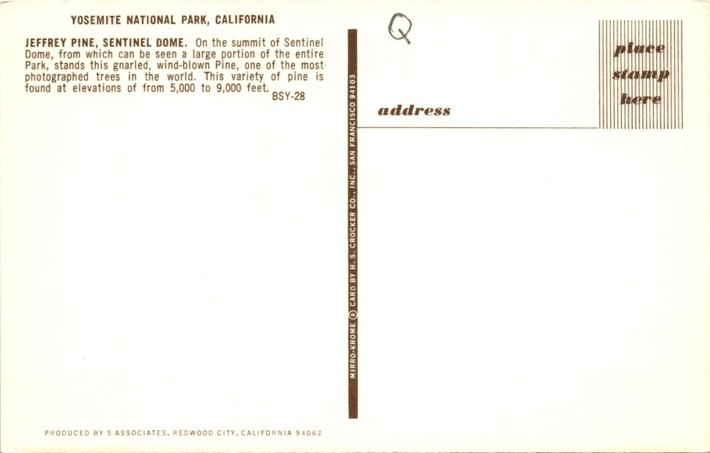 MAKE AN OFFER. THE MORE YOU BUY THE BETTER DEAL I WILL ACCEPT The postcard features a photograph of a Jeffrey Pine tree on Sentinel Dome in Yosemite National Park, California. The Jeffrey Pine is a distinctive tree known for its gnarled and wind-blown appearance, making it one of the most photographed trees in the world.