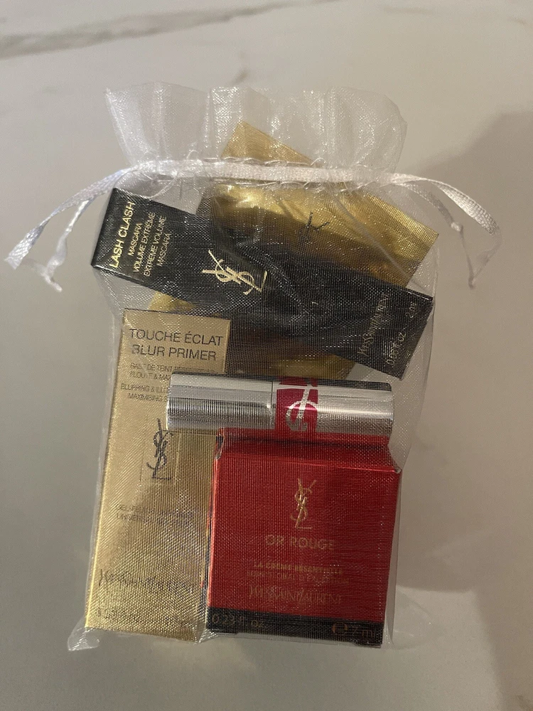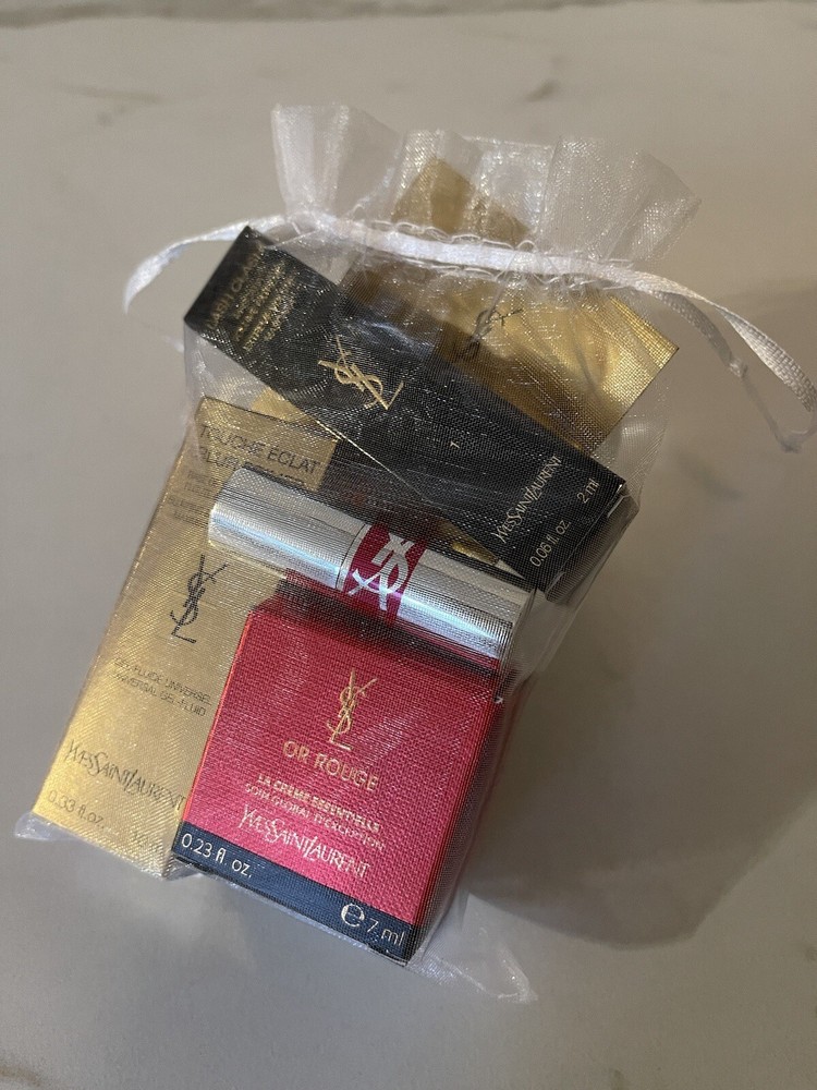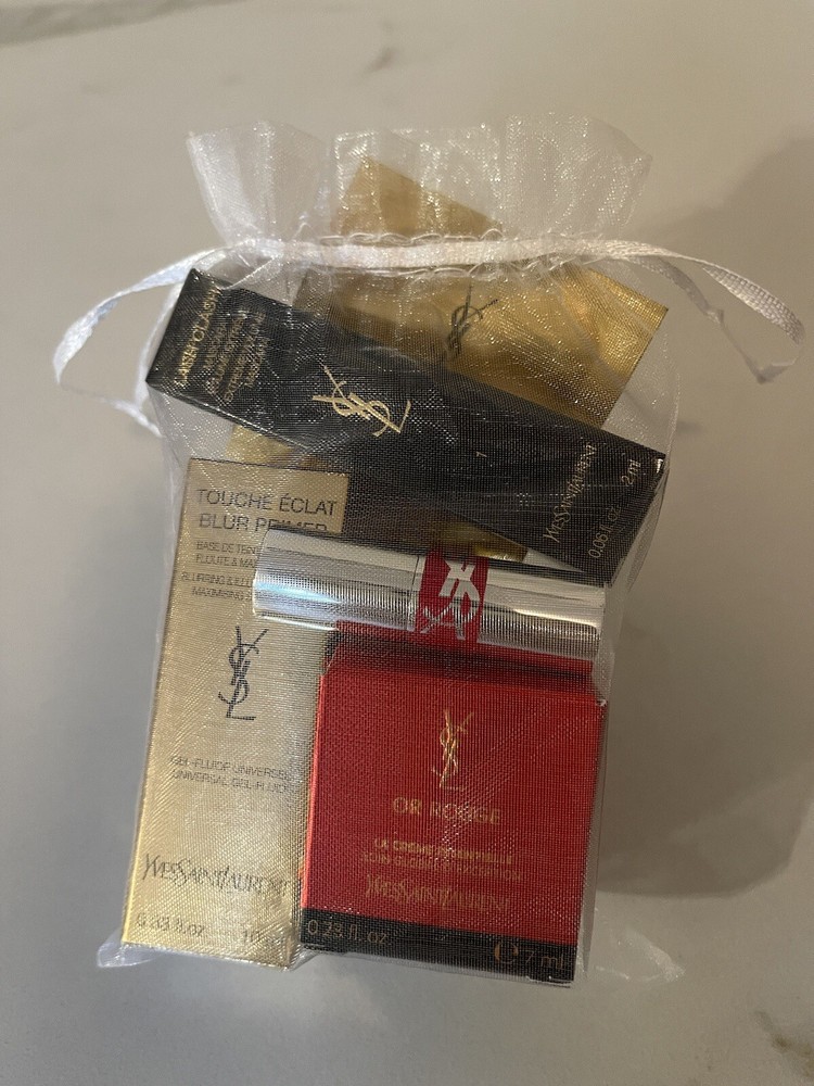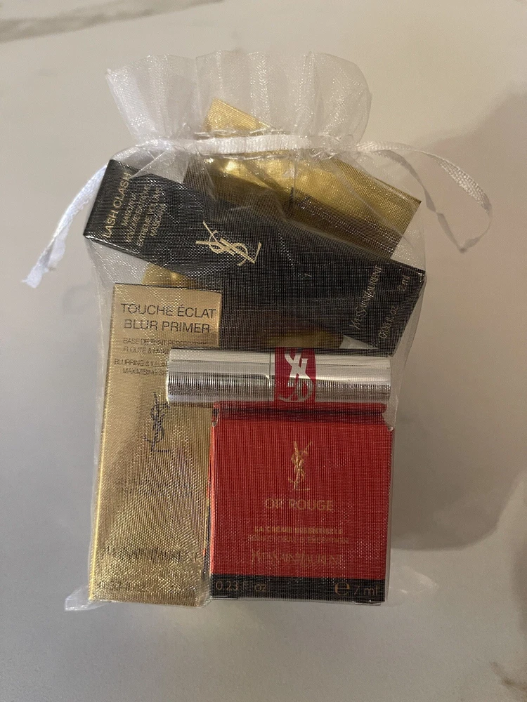 YSL 5 Pc Gift Set Yves Saint Laurent With Makeup Pouch NEW! -Yves Saint Laurent YSL Touche Eclat Blur Primer 0.33 fl.oz. 10ml. Mini Brand Yves Saint Laurent Product Benefits Brightening Item Form Serum Skin Type All Package Information Bottle Finish Type Natural .33 oz. Mini Suitable for all skin types Smooths and blurs imperfections, and enhances the radiance of your favorite foundation. -LE SERUM 0.03 fl .oz .1ml. -Lip moisturizer small size . -Yves Saint Laurent Or Rouge Crème Riche; WHAT IT IS: A crème made in France to help maximize rich hydration; it is essential for dramatic skin renewal on dryer skin WHAT IT DOES: Crème Riche moisturizing cream is formulated to replenish moisture and defend against fine lines and wrinkles INGREDIENT HIGHLIGHTS: The powerful pistils of the saffron flower help revive skin cell energy HOW TO USE: Warm the formula for a few seconds between your fingers, then press gently into the skin. Size ;0.23fl.oz .7ml -Yves Saint Laurent Lash Clash Extreme Volume Mascara; RESEARCH RESULTS: In a self-assessment test of 100 women: 96% said product wears for up to 24 hours 93% said brush catches all lashes 90% said brush spreads formula evenly Ophthalmologist tested and suitable for sensitive eyes and contact lens wearers. Size ;0.06 fl .0z. 2ml