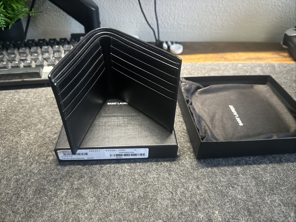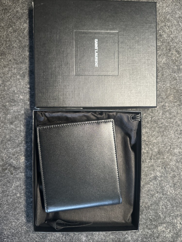 The YSL Bi-Fold Wallet in Black Leather is a stylish and functional accessory from the renowned brand Saint Laurent. Made in Italy and crafted from high-quality leather, this wallet features a solid black color with the iconic logo as the design theme. Perfect for both men and women, it offers a one-size fit for all and comes with the convenience of being a folding wallet. Ideal for everyday use, this bi-fold wallet exudes sophistication and luxury, making it a must-have addition to any fashion-forward collection.