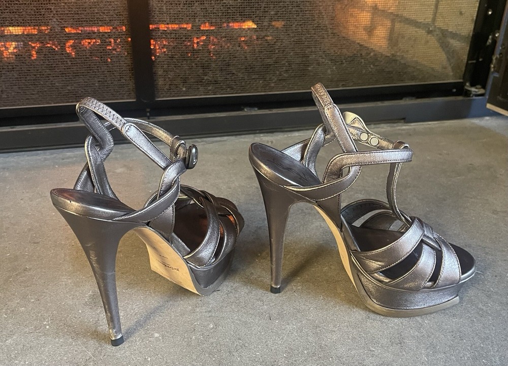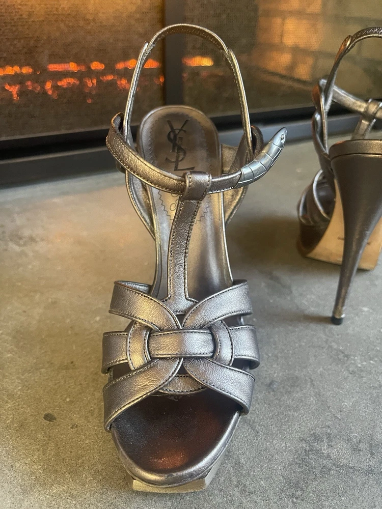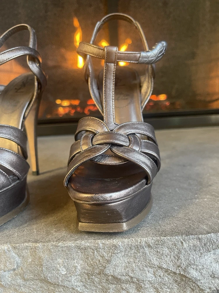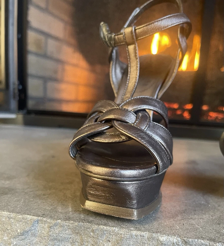 YSL Platform Sandals Excellent condition, minor signs of wear. Heels just redone Gorgeous sandals- classic. Metallic color leather. Snake buckle strap 5.25 inch heel 1.25 inch platform
