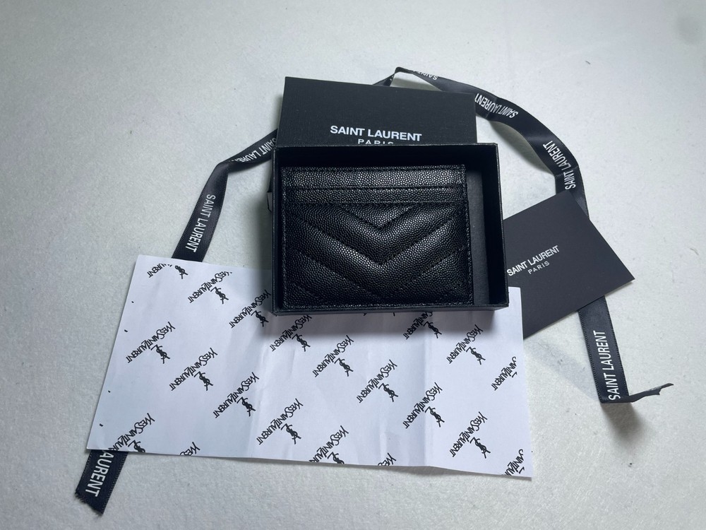rafted from luxurious leather, this YSL Saint Laurent card holder is an essential accessory for the modern man. Its sleek black color is accented with the iconic logo, adding a touch of sophistication to this slim piece. Perfect for carrying your essential credit cards, this wallet is both practical and stylish. The card holder is thoughtfully designed with a dedication to quality and longevity, manufactured between 2020 and 2029. It's an ideal choice for those who appreciate the timeless appeal of Saint Laurent and seek a blend of elegance and function in their everyday accessories.