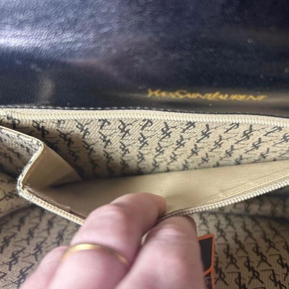 Authenticated Vintage YSL Black Leather Quilted Clutch Bag - Excellent Condition! Step up your style with this stunning vintage Yves Saint Laurent clutch! Crafted from glossy black leather with iconic geometric quilting and a central strap closure, this chic purse exudes timeless elegance. The interior features the classic YSL monogram fabric lining, with a spacious compartment for your essentials and zipper pocket. Perfect for a night out or as a collector’s piece! Measurements (approx.): 10” L x 7” H x 2” D Condition: Excellent condition—lightly used with minimal wear, no major scratches or stains! See photos. Details: Made in Italy, iconic YSL design, perfect for evening wear or special occasions. Originally retailed for $800+. Will add a chain for free upon request.