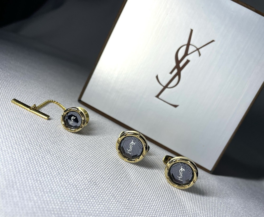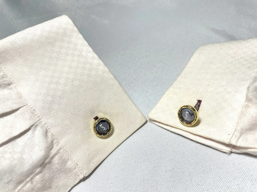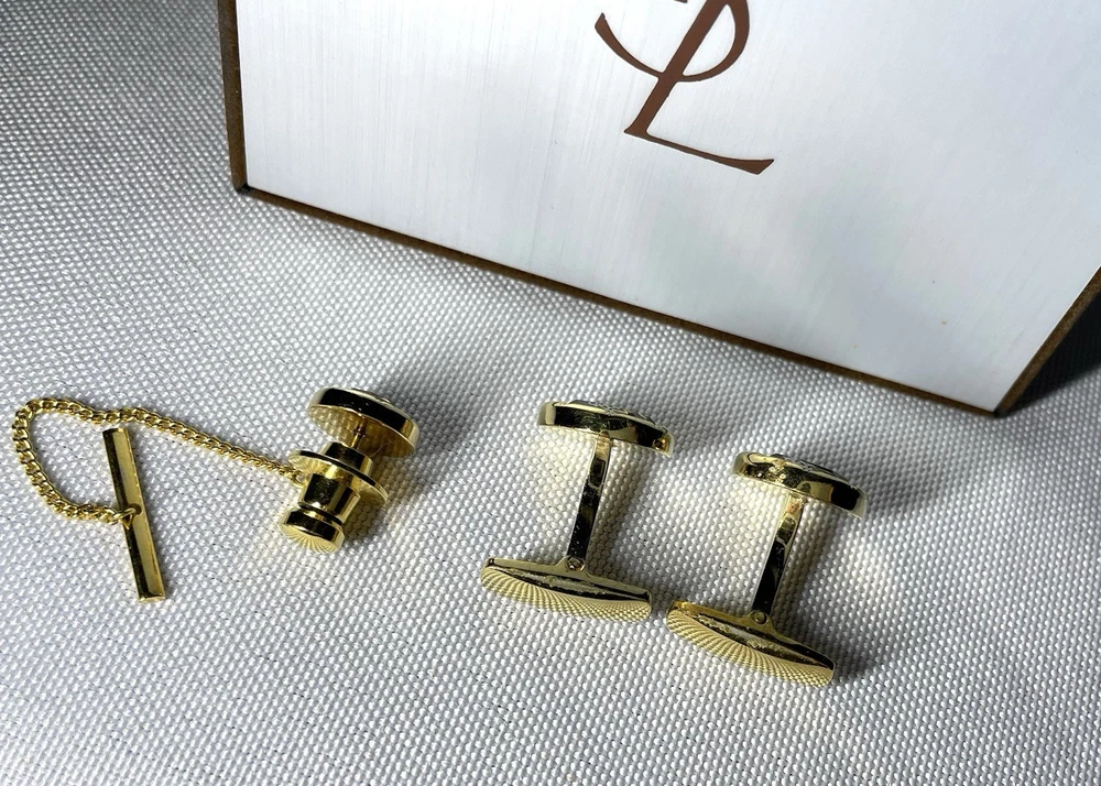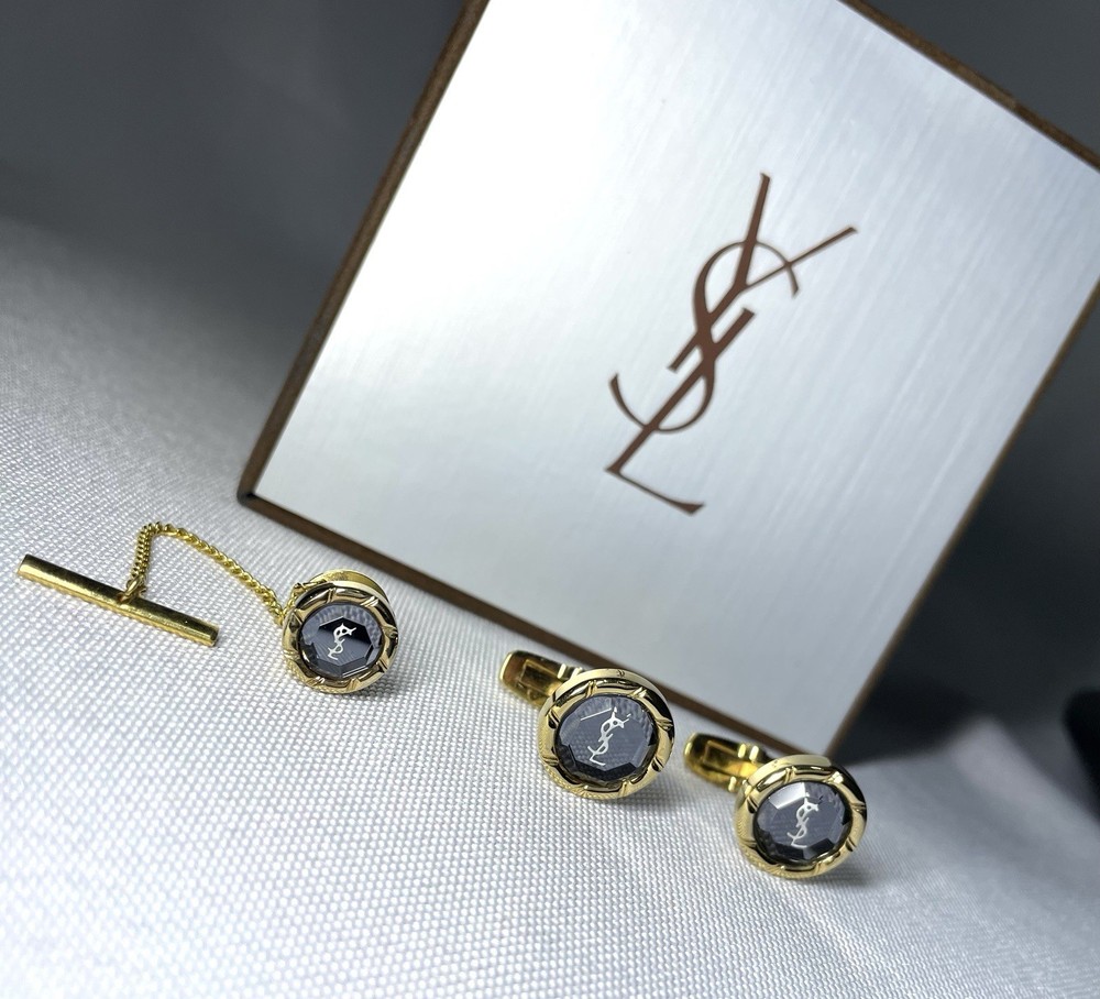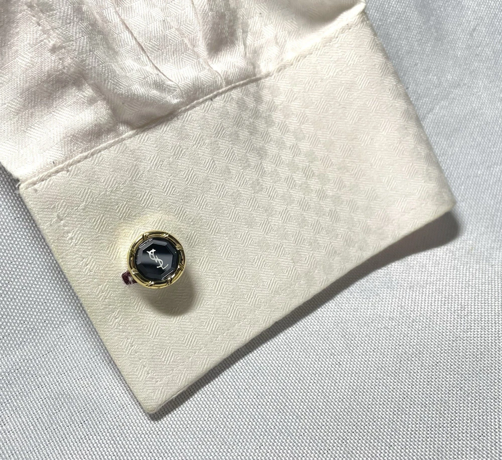 YSL Yves Saint Laurent gold black cufflinks Titanic pin brooch logo