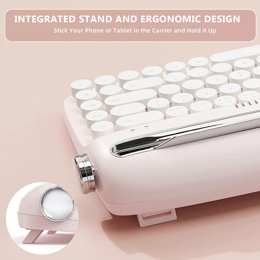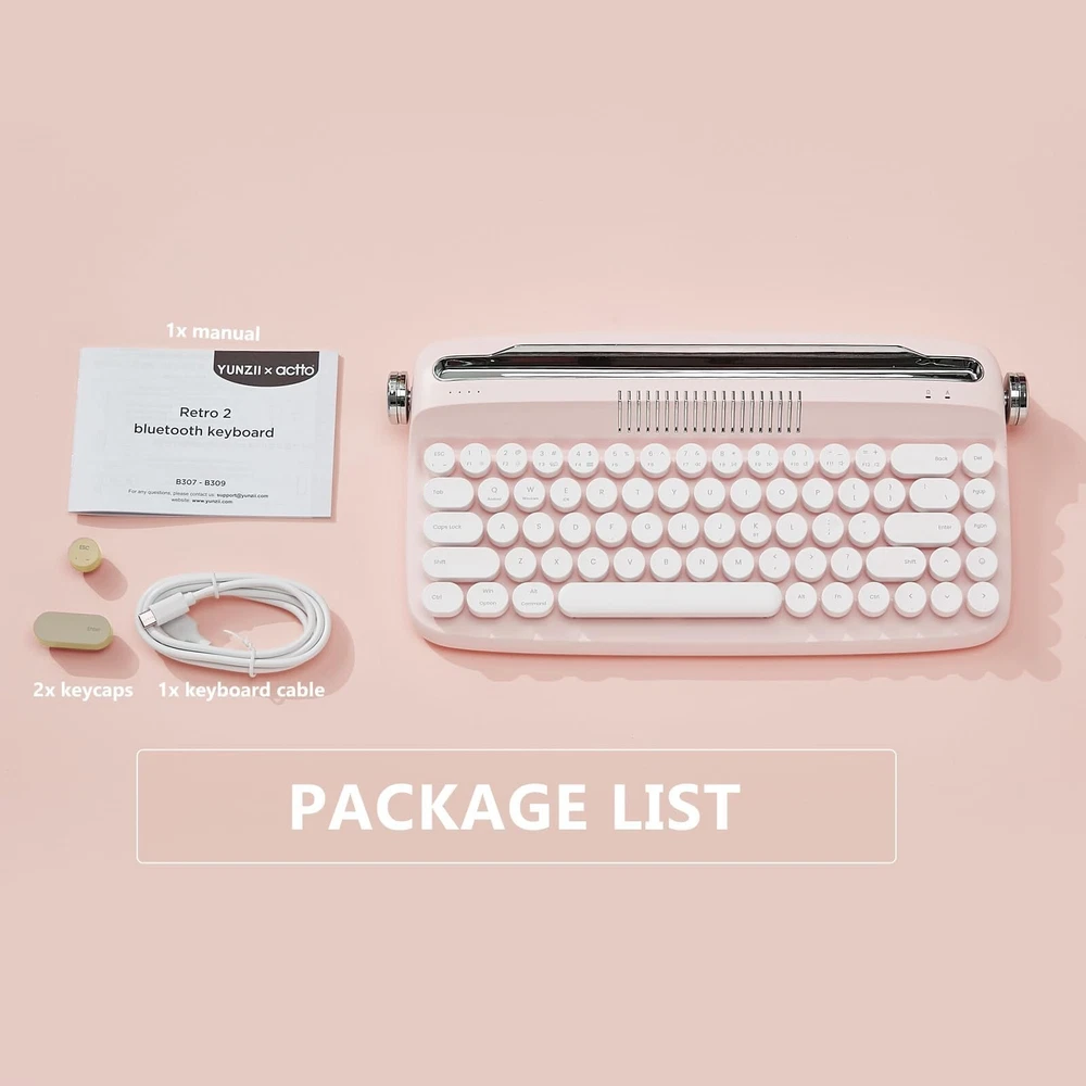 YUNZII Upgraded Wireless Typewriter Keyboard, Retro Aesthetic with Integrated Stand,Cute Round Keycaps, USB-C/Bluetooth Connection for Table, Phone, PC and Win/Mac/Android (B307, Baby Pink) Product Details Size: B307 Style: Baby Pink Brand: YUNZII MPN: B307 UPC: Does not apply EAN: Does not apply Brand: YUNZII Compatible Devices: Laptops, Tablets, Smartphones Connectivity Technology: Bluetooth, USB-C Keyboard Description: Membrane Recommended Uses For Product: Everyday Use Special Feature: Integrated Stand, Rechargeable Color: Pink Number of Keys: 68 Keyboard backlighting color support: Single Color Style: Baby Pink Package Dimensions: 14.65 x 7.64 x 2.48 inches Item Weight: 0.035 ounces Manufacturer: YUNZII Item model number: B307 Batteries: 1 Lithium Ion batteries required. (included) Date First Available: June 13, 2023 WIRELESS RETRO CUTE KEYBOARD:The YUNZII Upgraded wireless retro keyboard adds knob control, rechargeable battery and Bluetooth & wired connections. The colorful keyboard offers a unique blend of vintage charm and modern typewriter functional, with its compact layout, retro keyboard typewriter style, pastel colored keyboard with round keycaps. Bringing a more enjoyable typing experience with this aesthetic keyboard. BLUETOOTH AND WIRED CONNECTIVITY: The cordless keyboard features the latest Bluetooth 5.0 technology and stable wired connection. The wireless compact keyboard built in a rechargeable battery and come with a keyboard cable for wired connection and charging. VINTAGE TYPEWRITER KEYBOARD WITH INTEGRATED STAND: The wireless typewriter keyboard includes an integrated stand holder for pad, phone and tablet, which matches the vintage aesthetic of your desk and home office. The retro keyboard also includes adjustable feet, allowing you to set the angle for maximum comfort during long typing sessions. The built-in tablet or phone holder is 11.6x0.5 inches that can fit most pads. 68-KEY MINI TYPEWRITER KEYBOARD WITH KNOB CONTROL: Despite its compact size, the B307 membrane keyboards features 68 keys and all the functionality typer need for efficient typing. 2 knobs are functional. Turn the knob on the left to change the connection channel. Turn the knob on the right to change the volume. This functional and compact design make the keyboard an ideal choice for desk accessories & workspace organizers. MULTI-DEVICE WIRELESS KEYBOARD FOR MULTI OS: The wireless rechargeable keyboard connect via Bluetooth and USB-C wired on Windows, Android or mac iOS systems, Support all kinds of devices including Pad/PC/Laptop/Tablet/Smartphone.The package include a retro wireless keyboard, an extra red keycap, manual.