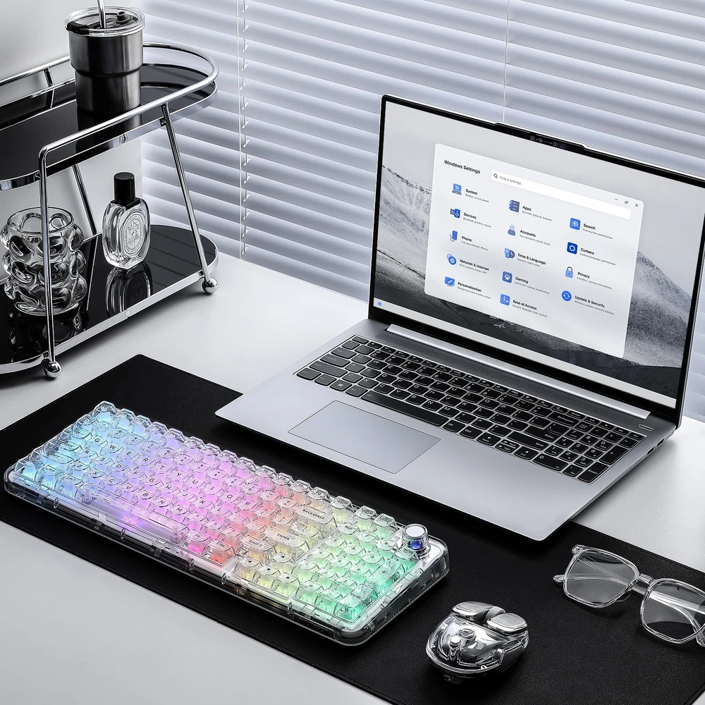 YUNZII X98 QMK/VIA Wireless Mechanical Gaming Keyboard with Knob,Tri-Mode BT5.0/USB-C/2.4GHz Hot Swappable Keyboard,Pre-lubed Switches Gasket Mount RGB Backlit for Wins/Mac Tri-Mode Wireless Mechanical Keyboard for Multi Device:YUNZII X98 mechanical keyboard supports wired, 2.4GHz wireless, and Bluetooth connections. Type-C Wired mode ensures ultra-low latency for PC gaming keyboards enthusiasts, while wireles s and Bluetooth modes eliminate cable clutter, making your desk cleaner. The gaming keyboard can easily connect up to 5 devices, effortlessly switching between laptops,chromebook,desktop,monitors. QMK/VIA Custom Keyboard with Knob:YUNZII X98 is a 98% layout mechanical gaming keyboard featuring QMK/VIA open-source firmware and a function knob. Unleash your creativity with full customization: remap keys, change layouts, create macros, adjust RGB effects, and customize the rotary knob (default: volume). Easily configure multiple profiles for different games or work settings. Hot Swappable Keyboard with Pre-lubed Switches:X98 Custom keyboard features a hot swappable socket compatible with 3-pin and 5-pin mechanical switches. Equipped with pre-lubed Snow Switches, the pre-lubed switches of the creamy mechanical keyboard offers silky-smooth, creamy typing and quiet actuation, perfect for users who wants out-of-box creamy and reliable performance. Gasket Mount Keyboard with Satisfying Sound: Experience a milky, creamy acoustic profile with X98 gasket mount keyboard, which composed with 5 layers of dampening materials (Poron, IXPE, Silicone, and Sound Enhancement Pads). The gasket structure of the PC gaming keyboard better optimizes resilience and stability, offering a softer, more elastic hand feel with a solid keystroke response. Crystal Clear Keyboard with Vibrant RGB: X98 transparent keyboard crafted from high-transparency PC material, the clear casing and shine-through keycaps maintain purity and clarity. Double-layer clear keycaps not only keep the crystal aesthetic appeal but also ensure anti-fading of keycaps characters. The RGB keyboard featuring with south-facing LEDs and 16.8 million colors, light up your gaming setups!