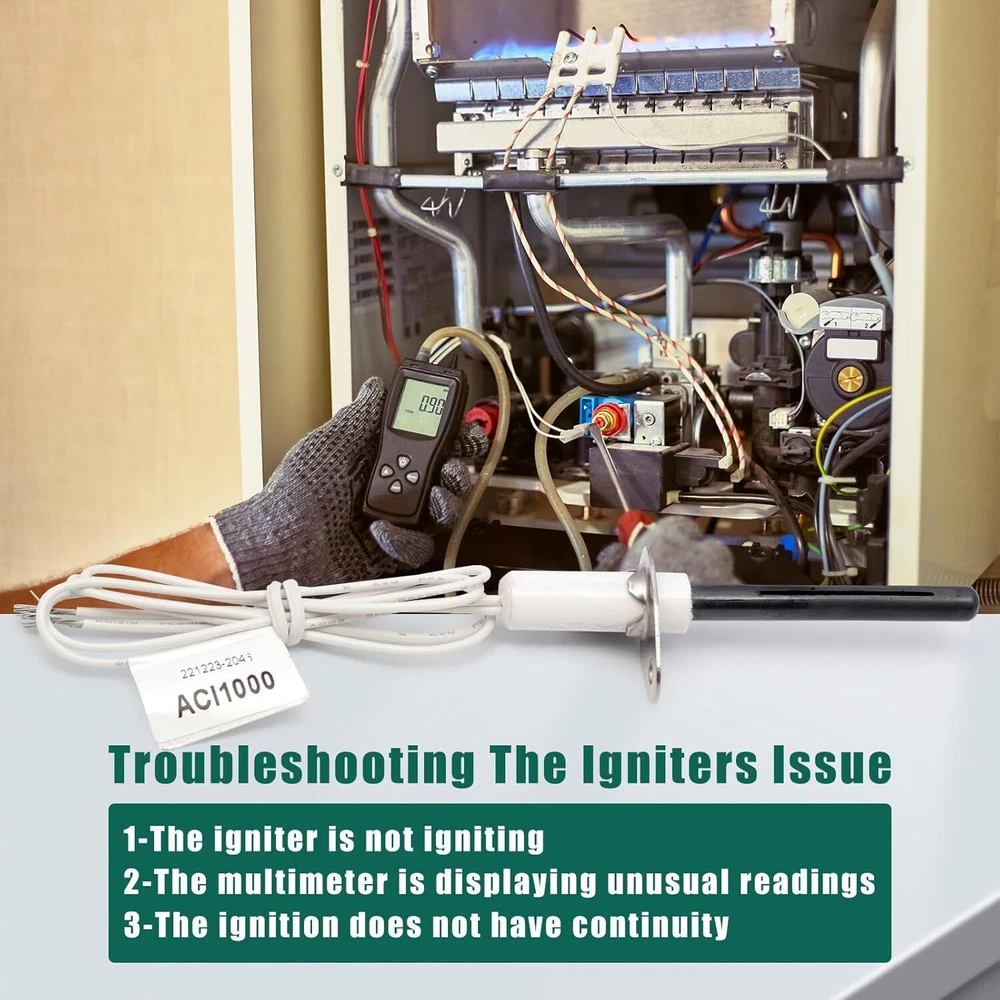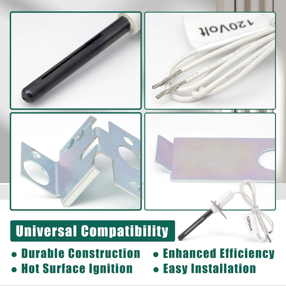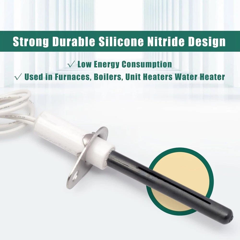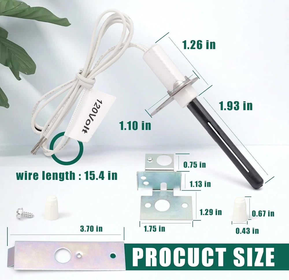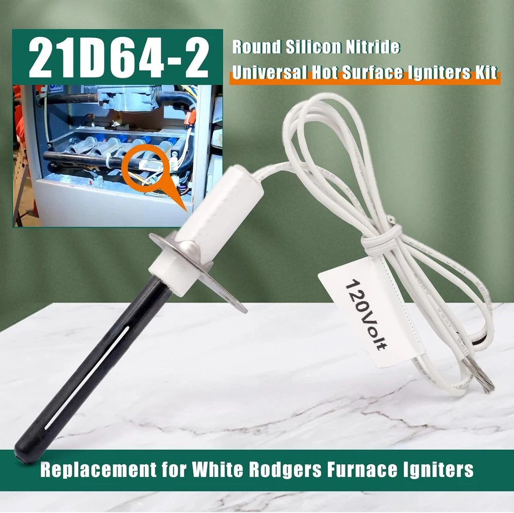 YUXIVCNE 21D64-2 Furnace Hot Surface Ignitors Replacement for White Rodgers Round Silicon Nitride Universal Hot Surface Igniters Kit (SSN2000) Product Details Manufacturer: YUXIVCNE Part Number: 21D64-2 Item Weight: 3.52 ounces Product Dimensions: 6.1 x 3.93 x 1.57 inches Country of Origin: China Item model number: 21D64-2 Included Components: 21D64-2 Furnace Hot Surface Ignitors Batteries Required?: No Universal Compatibility: This ignitors kit is compatible with a wide range of furnaces, including compatible with White Rodgers Round Silicon Nitride models. It offers a versatile solution for replacing faulty or worn-out ignitors, ensuring compatibility and ease of installation. Silicon Nitride Construction: The furnace hot surface ignitors is made of Silicon Nitride, ensure excellent thermal conductivity and resistance to extreme temperatures. Surface igniters universal 120 Volt HVAC igniters provides reliable and efficient ignition of the furnace burner. Enhanced Efficiency: By replacing your old ignitors with the 21D64-2 model, you can improve the efficiency of your furnace. The hot surface ignitors provides a consistent and reliable ignition source, resulting in better combustion and improved energy efficiency for your heating system. Hot Surface Ignition: This ignitors utilizes hot surface ignition technology, which provides reliable and efficient ignition of the furnace burner. The ignitors is designed to provide consistent and reliable performance, ensuring smooth operation of the furnace, helping to save on energy costs. Easy Installation: The kit includes all the necessary components and instructions for easy installation. Nitride ignitors with 15.5" leads, included universal mounting bracket and scremounting adapter bracket and 2 ceramic wire nuts, making it a convenient replacement option. COMPATIBILITY: Compatible with Evcon 211, 271D, 271 025-27774-000 1474-051 2TIN27INM, 27IP 025-26043-000 1474-052 aw 025-29050-000 Compatible with Goodman Raypak 025-32625-000 10401009 600915 025-32626-000 Compatible with Heit Rheem 025-39241-000 1096048, 62-22441-01 373-05342-700 Compatible with Hupp Industries 62-22868-82 473-12509-001 9050 62-22868-93 Williamson 9050 icp 1009604 109804 Compatible with Mor Flo -081 3200618 Compatible with Superior Fireplace 174-052 Hordyne 94851 Compatible with Detroit Radiator ### Compatible with Weil Mclain 511-330-139 511-330-190 511-330-193 White LBCo 1120-07549 Compatible with White Rodgers 21064-2 767A-301 7-306 767A-310 T67A-311 767A-350 7674-353 TGTASS, ### Metager 41-409,41-410,41-411 201N a1ai2s1-4t4 LH332S001A 201 uxs3zs002 50018 1380684 C238 654 c242 672 FEATURES: Round shape: The ignitors has a round shape, which allows for easy installation and replacement in most furnaces. Silicon Nitride construction: The ignitors is made of Silicon Nitride, features excellent thermal conductivity and resistance to extreme temperatures. Hot surface ignition: This ignitors utilizes hot surface ignition technology, which provides reliable and efficient ignition of the furnace burner. Easy installation: The kit includes all the necessary components and instructions for easy installation, making it a convenient replacement option. Long lifespan: The Silicon Nitride construction ensures a longer lifespan compared to traditional ignitors, reducing the need for frequent replacements. Energy-efficient: The hot surface ignition technology used by this ignitors is more energy-efficient than other ignition methods, helping to save on energy costs. Reliable performance: The ignitors is designed to provide consistent and reliable performance, ensuring smooth operation of the furnace.