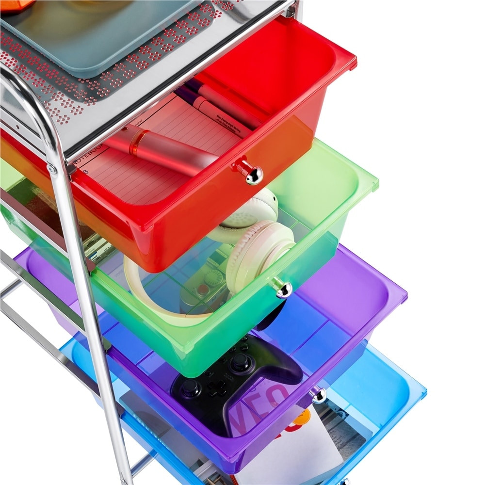 This 4-drawer storage trolley is provided with 4 wheels, 2 of which are lockable, ensuring both flexibility and stability. The design of the 4 vertically aligned drawers makes full use of limited space, meanwhile, allowing users to store different items separately. Besides, each of the drawers can be removed separately, therefore, you can use it as a simple storage box on your office desks or install it back after filling.Features:1. Space-intensive StructureThis storage cart is designed into 4 layers with a platform, which is a smart solution of making full use of limited space by expanding the space vertically. Besides, such structure also allows you to store different items separately.2. Round Iron HandlesWith 2 half-round iron handles on the 2 sides of the top platform together with 4 Free Shipping Over $49.99* Details Yaheetech Rolling Storage Trolley with 4 Drawers with Metal Frame Product Description: This 4-drawer storage trolley is provided with 4 wheels, 2 of which are lockable, ensuring both flexibility and stability. The design of the 4 vertically aligned drawers makes full use of limited space, meanwhile, allowing users to store different items separately. Besides, each of the drawers can be removed separately, therefore, you can use it as a simple storage box on your office desks or install it back after filling. Features: 1. Space-intensive StructureThis storage cart is designed into 4 layers with a platform, which is a smart solution of making full use of limited space by expanding the space vertically. Besides, such structure also allows you to store different items separately.2. Round Iron HandlesWith 2 half-round iron handles on the 2 sides of the top platform together with 4 castor wheels, users are allowed to push a cart full of papers by only 1 hand without any difficulty.3.Selected MaterialsThis storage bin organizer cart is made of chrome plated iron and PP, body-harmless, durable, lightweight and uneasy to oxidate. Specifications: Materialsiron, PP Layer Quantity; 4 Dimensions 13 x 14.5 x 30.5'' (L x W x H) Drawer (inner)12 x 9.1 x 4.5'' (L x W x H) Bearingeach drawer2 kg/ 4.4 lb; top platform7.5 kg/ 16.5 lb N.W.3 kg/ 6 lb G.W.4 kg/ 9 lb Note: 1. Please do not place or store items that exceed the max. weight capacity of this storage trolley. 2. Please allow slight errors due to manual measurement.