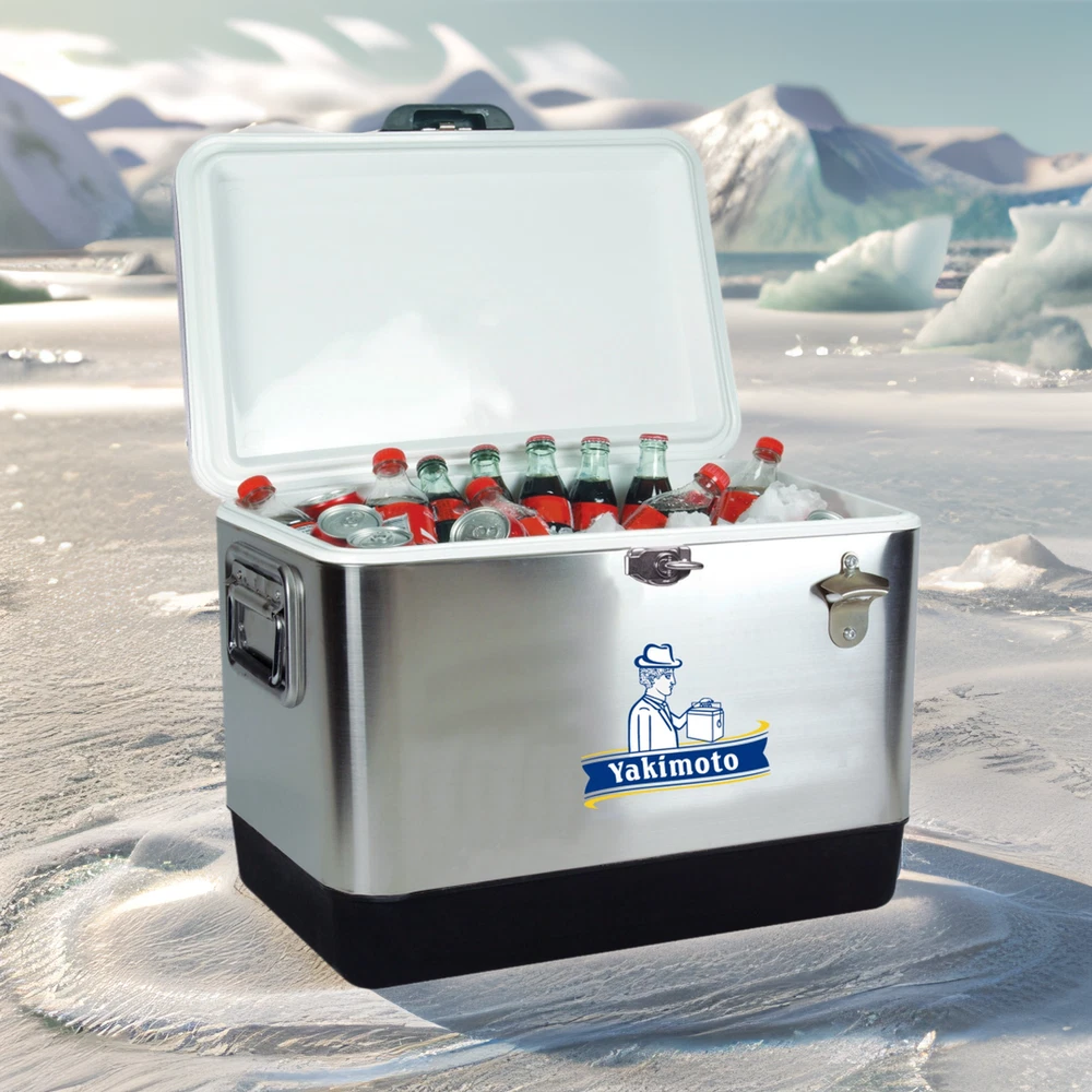 How does the cooler work? Our cooling technology is not comparable with other cool boxes. If you combine the Cooler Box Correct use, the temperature inside can be kept constant for many days - without power supply, in any climate zone, anywhere in the world. Product Information: Product Name: Waterproof Metal Ice Cooler 54 QT Yakimoto Vintage Stainles Steel Ice Chest Product Model: 2024JHH001 6 Capacity: 51 Liter Material: Stainless Steel+PU+Aluminium Size(Inch): 23.6 " x16. 5 " x16.3 ", Size(Cm); 60x42x41.5 cm Packing: Each piece in a carton Meas.: 62x43x47.5 cm G.W/N.W: 7.3/8.5 KG S · Huge 51 L (54 qt) Capacity: Portable ice chest features a generous 51 liter (54 quart) capacity that can hold up to 85 standard soft drink cans so you have room for whatever you need · Built-In Bottle Opener: This cooler features a bottle opener conveniently attached to the outside so you don?t have to scramble or search when you want a cold one · Eco-Friendly Cooling On the Go: Environmentally-friendly cooler features premium insulation and a securely locking steel latch to keep your drinks and snacks cool without electricity · Durable Construction: Expert craftsmanship and quality materials including rustproof stainless steel exterior and a rugged plastic base mean this ice chest is in it for the long haul · Easy to Clean: Stain-resistant food-grade plastic lining and leak-proof channel drain for no-tilt draining make emptying and cleaning your cooler a breeze Product Description This durable 51L / 54 Quart stainless steel ice chest is the ideal personal cooler to keep your favorite foods and beverages chilled and ready to drink. Fill this insulated cooler with ice and pre-chilled drinks and snacks for environmentally safe storage without the need for electricity. The solid steel latch and non-toxic plastic liner trap cold air inside for maximum efficiency, and the leak-proof channel drain makes cleanup a breeze. With its durable stainless steel finish, easy-to-carry rubberized handles and built-in bottle opener, this ice chest is the perfect accessory for day trips, tailgating, boating, fishing, hunting, camping or your next backyard BBQ. Good helper for you when go outside. Featuring portable, it can be applied in various situations, when you go for a long-distance self-drive travel, or you go out for a picnic and camping, or you use it as a moveable medical cooler box, etc. There is no doubt it plays an important role in outside activities. Our high-quality cool boxes offer you maximum independence and optimum cooling without electricity. Thanks to innovative high-performance insulation and special temperature elements, food and drinks stay fresh or frozen for days. Perfect for camping, outdoor adventures and everyday use, our robust, easily transportable cool boxes combine sustainability and efficiency. Don’t hesitate to Choose This Cooler!