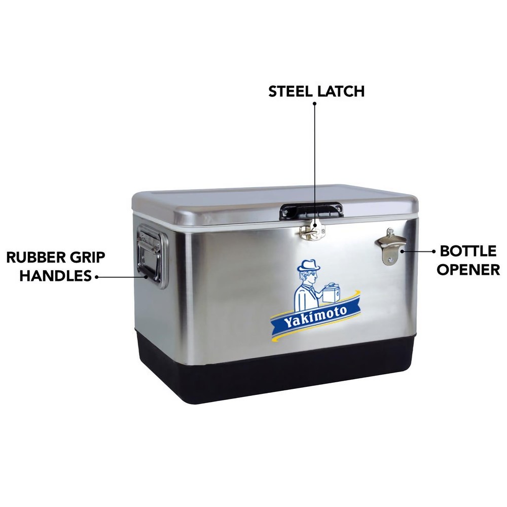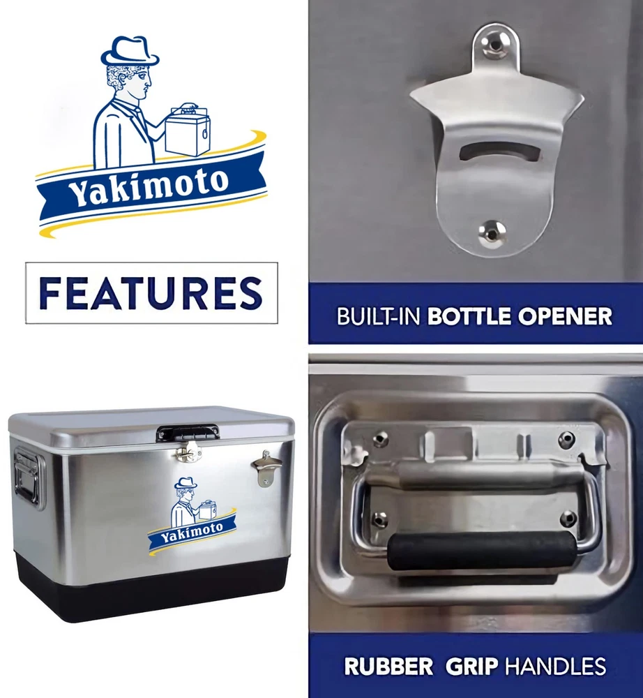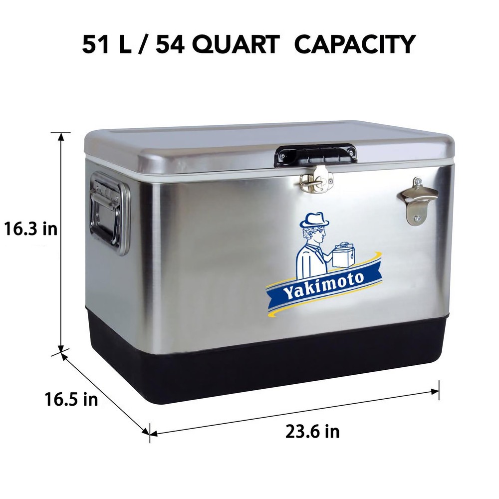 How does the cooler work? Our cooling technology is not comparable with other cool boxes. If you combine the Cooler Box Correct use, the temperature inside can be kept constant for many days - without power supply, in any climate zone, anywhere in the world. Brand Background?: Yakimoto: The Frozen Mission - A Global Fight for Survival Since 1979 Historical Anchor: WHO?s "Cold Chain Initiative" In 1979, the World Health Organization (WHO) launched humanity?s largest vaccine transport operation?shipping 4 million doses of smallpox vaccine from Geneva to Somalia, the final outbreak zone in Africa. With temperatures soaring to 122°F (50°C) and no reliable electricity, traditional refrigeration units failed mid-transit, jeopardizing millions of dollars? worth of lifesaving vaccines. At Addis Ababa Airport, Japanese engineer Hayato Yakimoto made a desperate gamble: he stripped aluminum panels from the cargo plane?s hull and rigged a makeshift insulated container using titanium climbing carabiners from his gear. Drawing on alpine thermal preservation techniques, he maintained the vaccines? integrity through the final leg to Mogadishu, ultimately enabling the WHO to declare smallpox eradicated in 1980. From Historic Triumph to Brand Legacy Hayato Yakimoto was the uncle of Yakimoto?s founder, Taro Yakimoto. Family archives preserve the specs of that improvised lifesaving container: -13°F to 46°F (-25°C~8°C) temperature control (3x stricter than commercial standards of the era) 72-hour passive insulation (harnessing residual heat from aircraft hydraulic fluid) Crash-resistant design (tested through 5 emergency landings) These parameters, forged through blood and sweat, became Yakimoto?s foundational doctrine?a sacred text encoding the brand?s technological origins. Product Information: Product Name: Waterproof Metal Ice Cooler 54 QT Yakimoto Vintage Stainles Steel Ice Chest Product Model: 2024JHH001 6 Capacity: 51 Liter Material: Stainless Steel+PU+Aluminium Size(Inch): 23.6 " x16. 5 " x16.3 ", Size(Cm); 60x42x41.5 cm Packing: Each piece in a carton Meas.: 62x43x47.5 cm G.W/N.W: 7.3/8.5 KG S · Huge 51 L (54 qt) Capacity: Portable ice chest features a generous 51 liter (54 quart) capacity that can hold up to 85 standard soft drink cans so you have room for whatever you need · Built-In Bottle Opener: This cooler features a bottle opener conveniently attached to the outside so you don?t have to scramble or search when you want a cold one · Eco-Friendly Cooling On the Go: Environmentally-friendly cooler features premium insulation and a securely locking steel latch to keep your drinks and snacks cool without electricity · Durable Construction: Expert craftsmanship and quality materials including rustproof stainless steel exterior and a rugged plastic base mean this ice chest is in it for the long haul · Easy to Clean: Stain-resistant food-grade plastic lining and leak-proof channel drain for no-tilt draining make emptying and cleaning your cooler a breeze