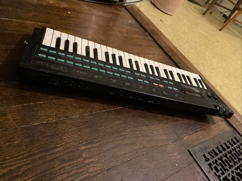 This Yamaha DX100 Digital Programmable Algorithm Synthesizer is a great addition to any musician's gear. With 49 synth keys, it allows for dynamic and expressive performances. The synthesizer is made by Yamaha, a trusted brand in the music industry, and was manufactured in Japan. This keyboard synthesizer is perfect for anyone looking to elevate their music to the next level. Its digital nature allows for precise and consistent sounds, while the batteries provide the freedom to use it anywhere. Additionally, it comes with a cord for easy connectivity. Don't miss out on this amazing opportunity to enhance your musical abilities. Tested with batteries, no power cord, all seems to work and be in great condition!
