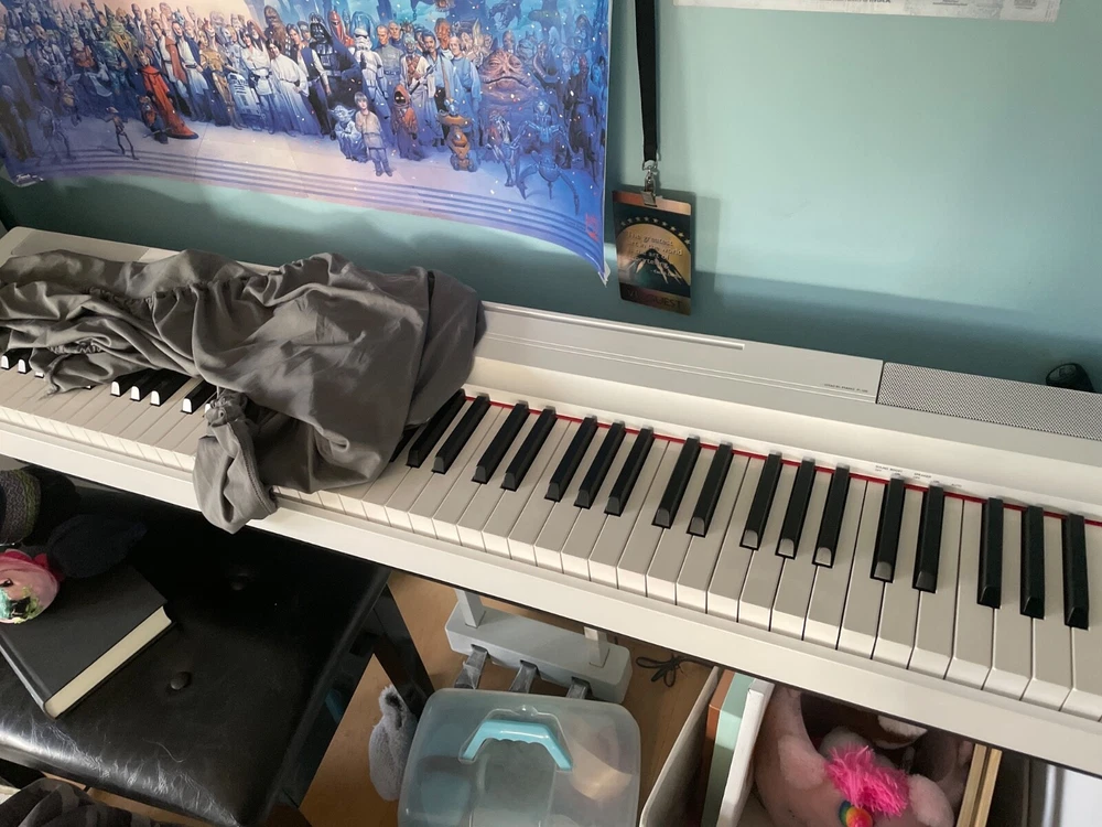 Very slightly used but a bit older. Missing the thing that props up the music sheets