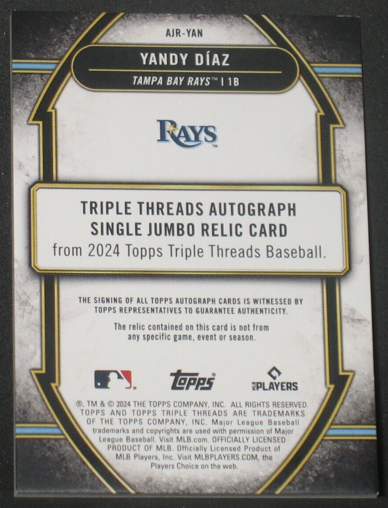 Yandy Diaz 2024 Topps Triple Threads Jumbo Relic Autographs Amethyst game-used parallel autographed insert (#AJR-YAN). Serial numbered 01/75 on the front of the card! He signed this card on the front in blue ink, and the autograph is guaranteed by the card company itself, as it came directly out of a pack! What a great pick-up for Tampa Bay Rays collectors! U.S. Buyers get free shipping!! International buyers to add $10.00 for safe and secure shipping in a top loader and a bubble mailer. If I can answer any questions, please let me know! Thanks for looking!