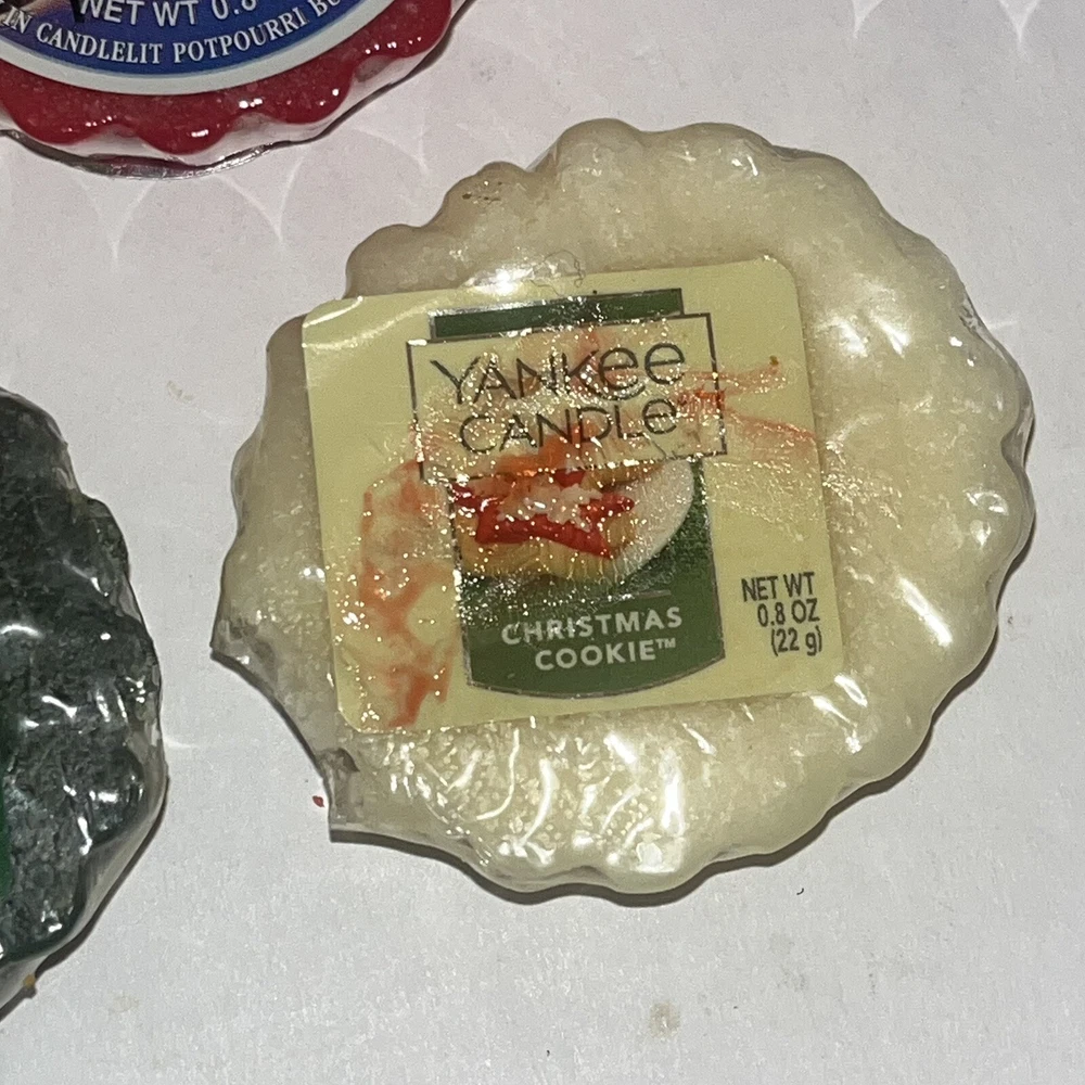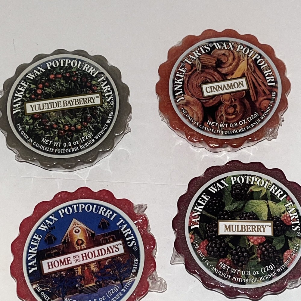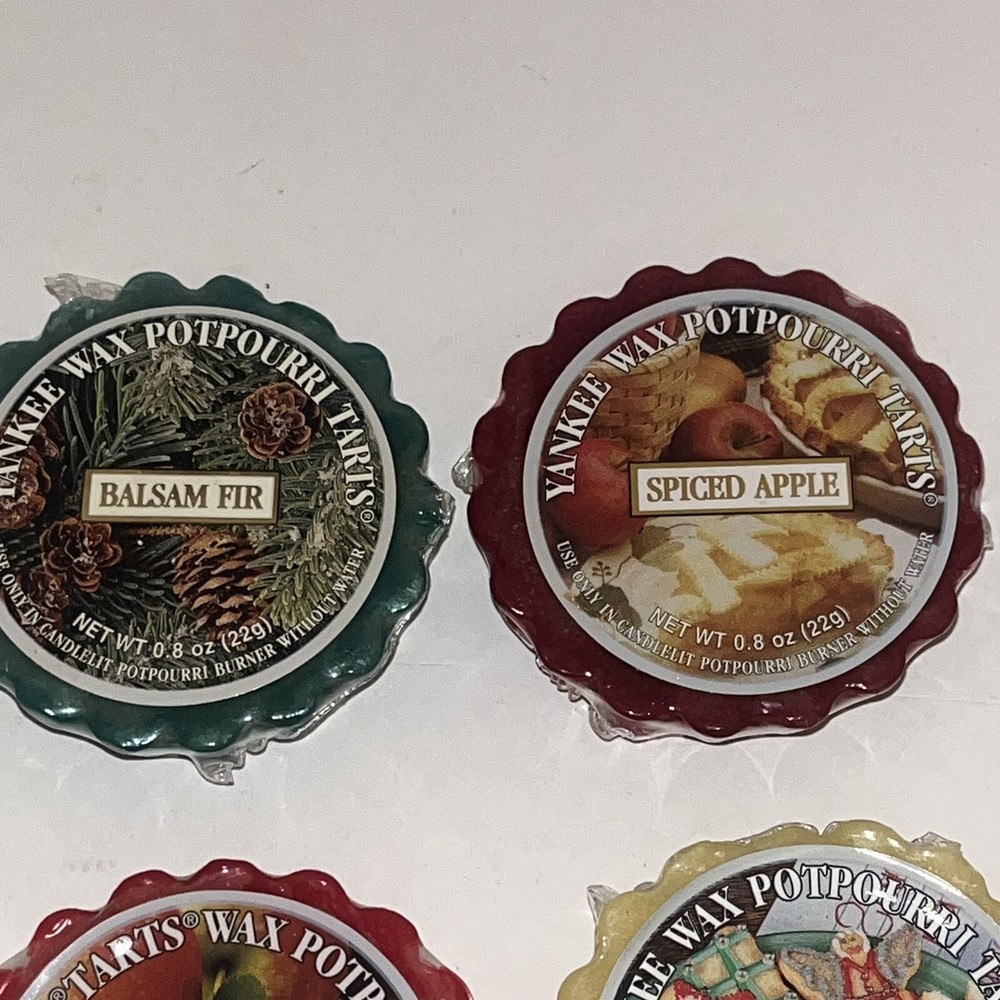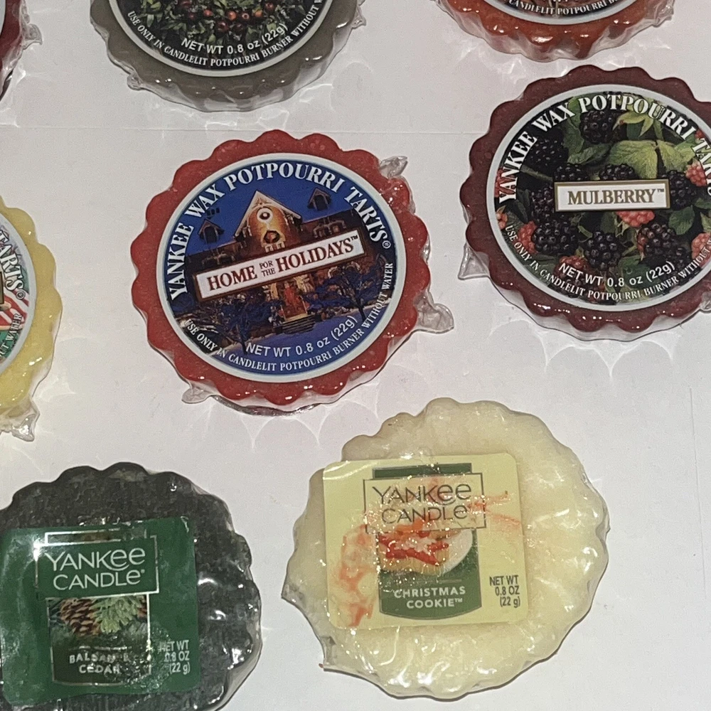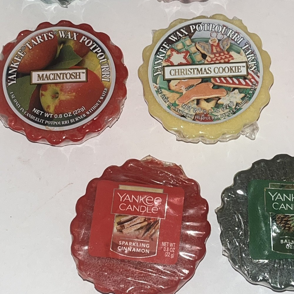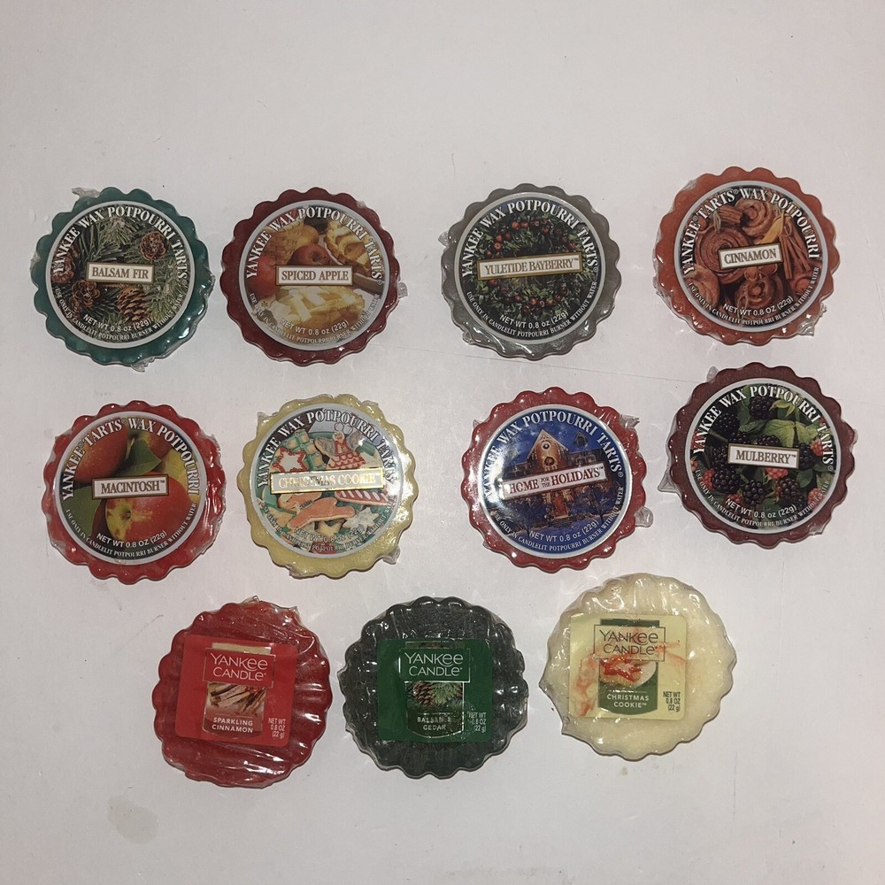 Yankee Candle Tarts 22g Mixed Lot of 11: Balsam Fur, Spiced Apple, Yuletide Bayberry, Cinnamon, Macintosh, 2 Christmas Cookie, Home for the Holidays, Mulberry, Sparkling Cinnamon, and Balsam Cedar. Each tart has its original cellophane wrapper. Some have a sticky label. Scent is still strong.