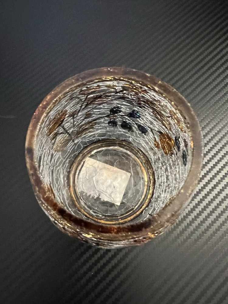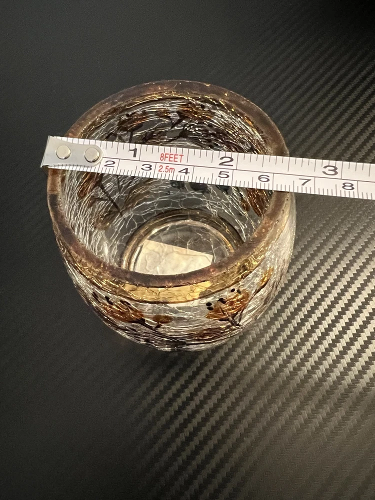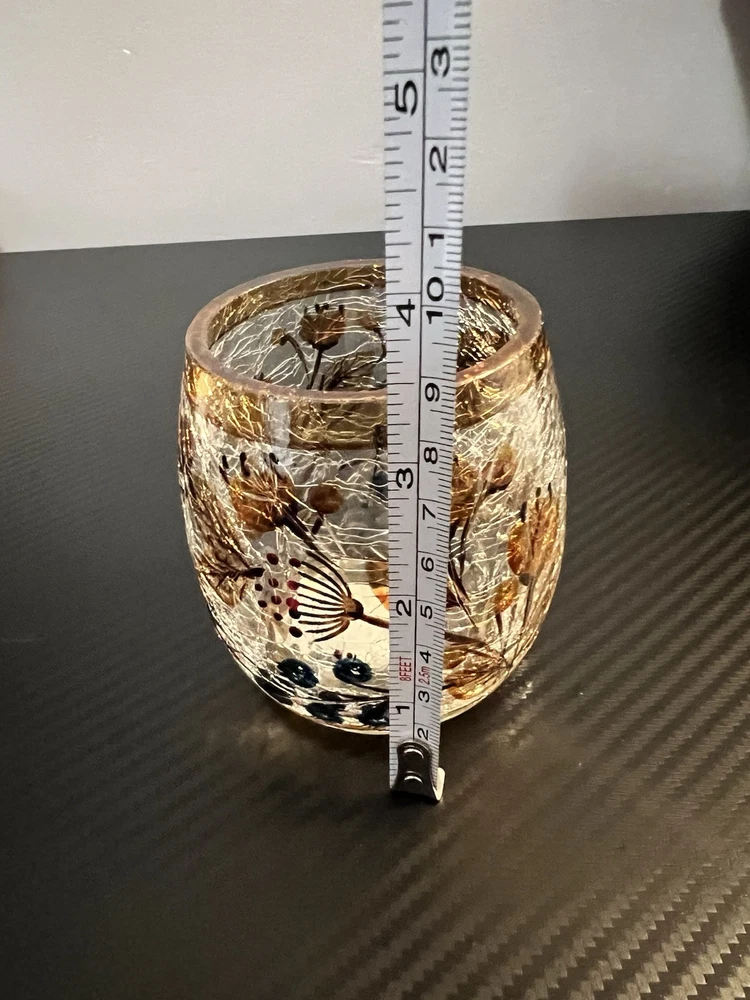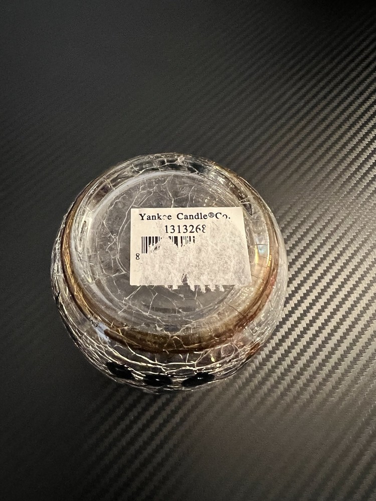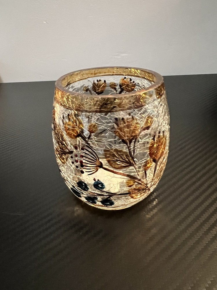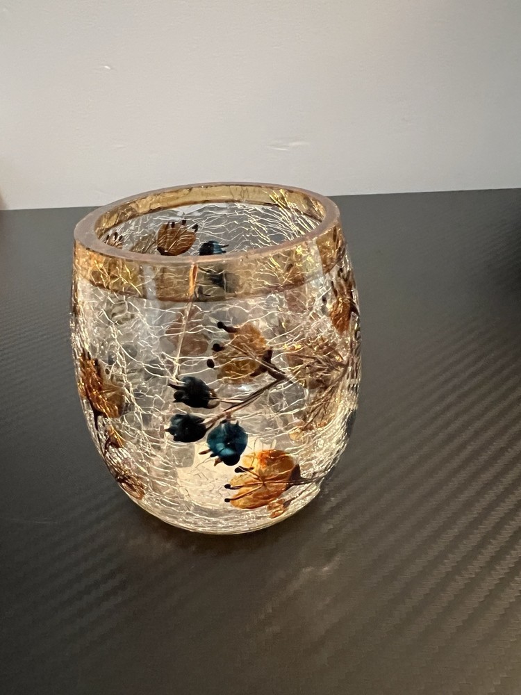 Yankee Candle Crackle Glass Votive Candle Holder Fall Flowers Brown Trim good pre-owned condition - part of sticker on bottom missing - no other flaws noticed - see photos