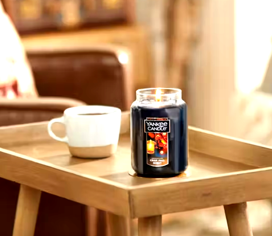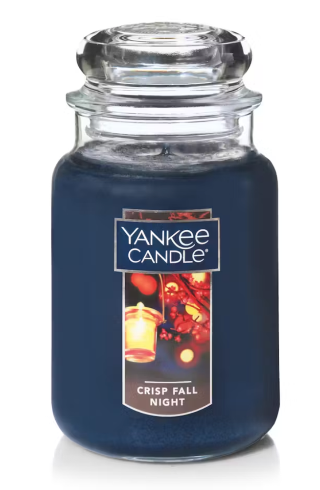 This is a Fresh & Clean fragrance. The autumn evening invites with brisk earthy notes and dreamy interludes of lavender and woodland whispers. Fragrance Notes: Top: Bergamot, Grapefruit, Black Peppercorn Mid: Lavender, Maple Leaf Base: Vetiver, Oak Top note is the initial impression of the fragrance, middle note is the main body of the scent, and base is its final impression. Crisp Fall Night is Fresh & Clean The Yankee Candle Crisp Fall Night Large Jar is a blue wax candle with a modern design. It has a nature-themed scent and a burning time of 110-150 hours. The jar is 7 inches tall and 4 inches wide, weighing 2 lbs 8.5 oz. Perfect for any room, this scented pillar candle evokes the essence of a campfire on a crisp fall night with notes of leaves, pumpkin, and apples. Made in the United States.