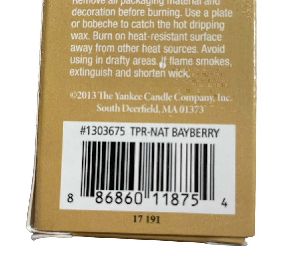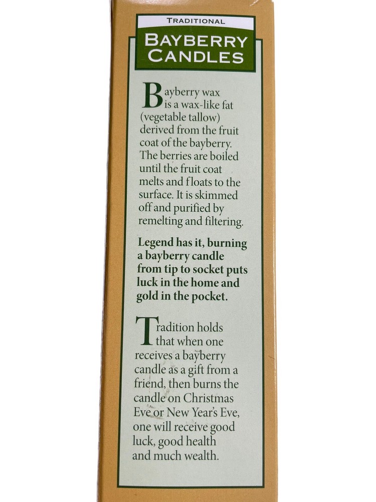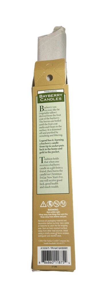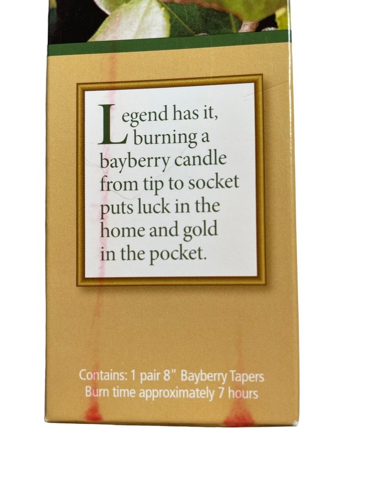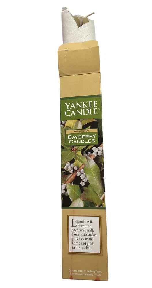 Add a touch of elegance to your home with this set of two Yankee Candle Pure Bayberry 8" Taper Candles. Their traditional style and green color make them perfect for any occasion, especially Christmas and New Years. The bayberry scent will fill your home with a welcoming aroma that lasts more about 7 hours. Use them to decorate your entryway, foyer, kitchen, bedroom, living room, lounge, or dining room. These candles come in an open box and are in like-new condition. The outer box has a red stain, see photos. Old stock 2013