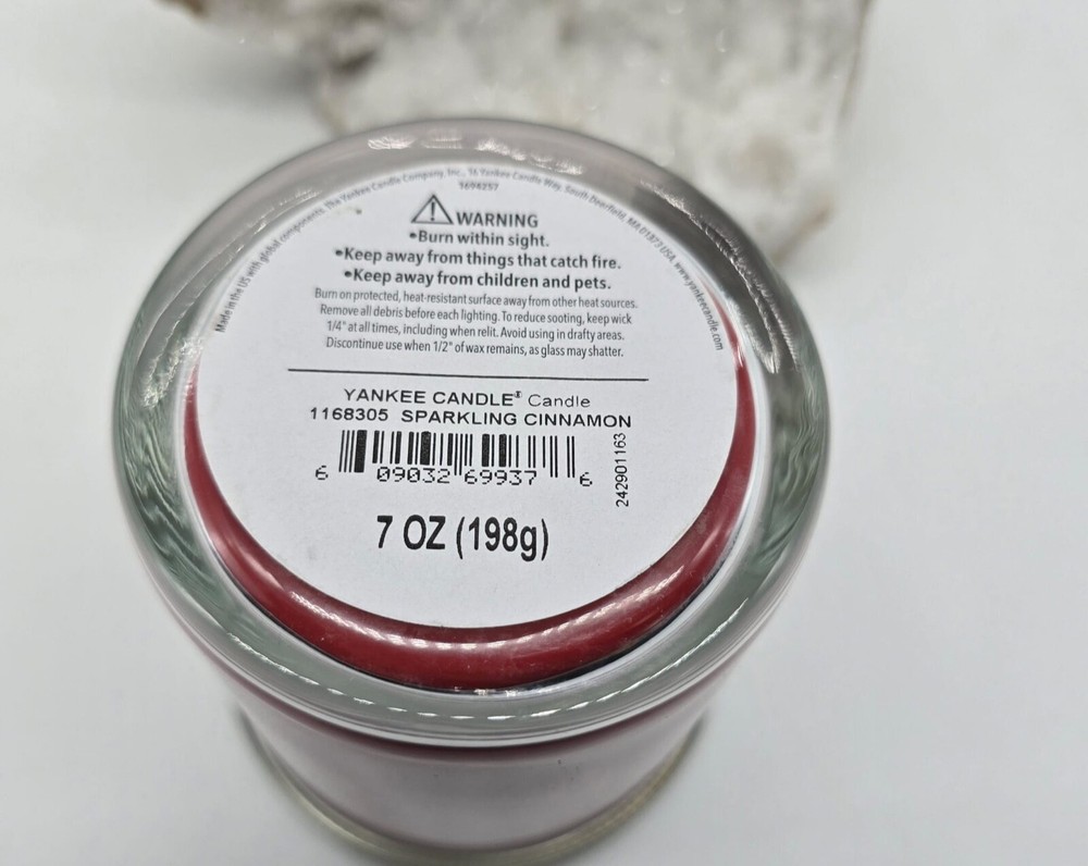Material: Paraffin Wax Item Height: 4 in Number in Pack: 1 Item Width: 4 in Handmade: No Shape: Glass Scent: Sparkling Cinnamon Size: Small 7 Oz Color: Red Brand: Yankee Candle Burning Time: 35 hours Theme: Seasonal Features: Scented Type: Scented Candle Model: Yankee Candle 7Oz Style: Country Item Length: 4 in Item Weight: 1.11 lb Country/Region of Manufacture: United States