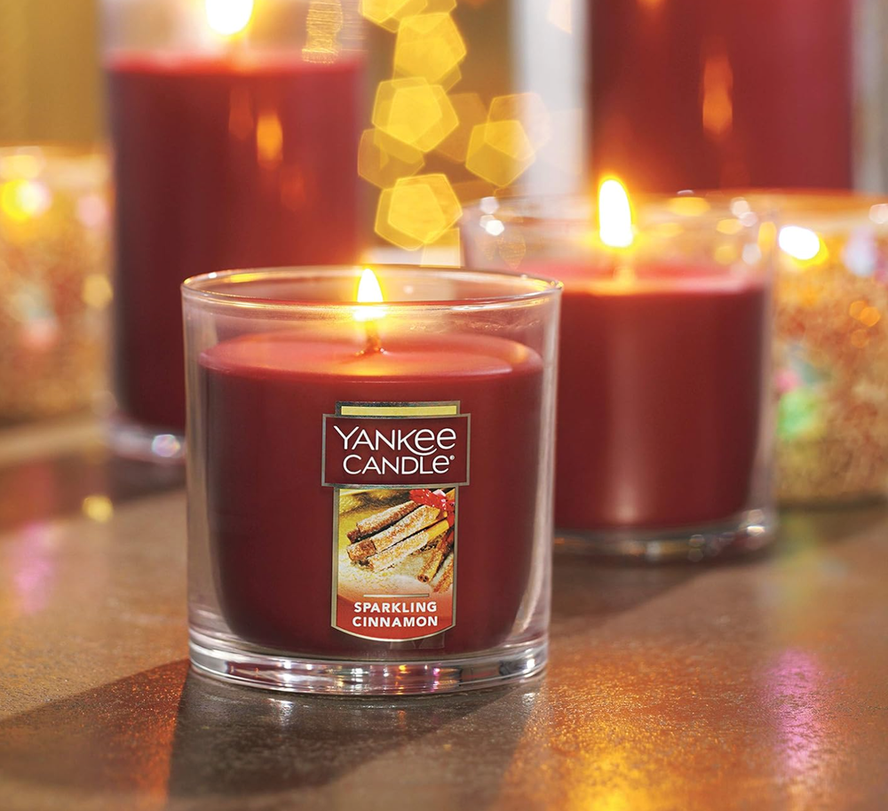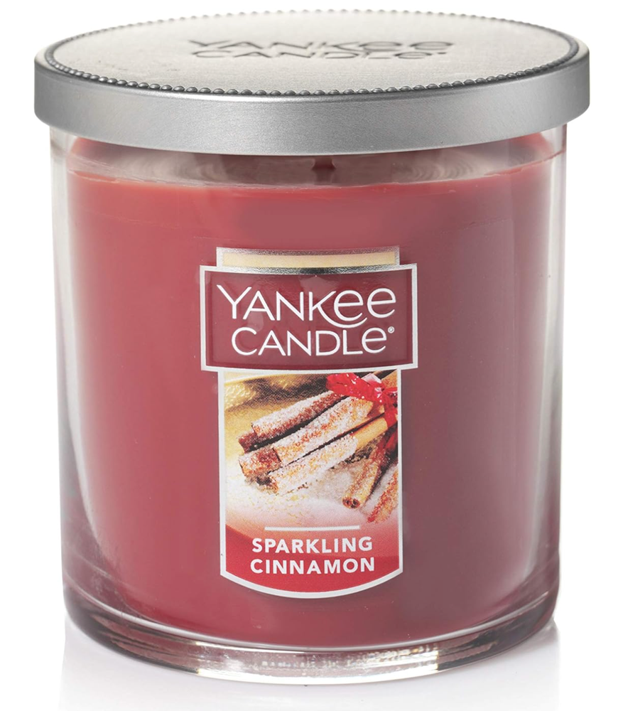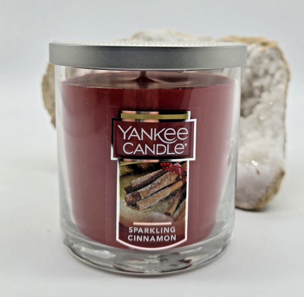 Yankee Candle Sparkling Cinnamon Scented, Classic 7oz Small Tumbler Single Wick Candle, Over 35 Hours of Burn Time Yankee Candle Sparkling Cinnamon is a 7-ounce small tumbler candle featuring a single wick and offering over 35 hours of burn time. This candle emits a warm, inviting aroma that combines the spicy warmth of real imported stick cinnamon with a hint of cloves, making it a perfect choice for creating a cozy atmosphere during every season. Fragrance: A blend of real imported stick cinnamon and a hint of cloves, providing a sweet and spicy scent. Wick: Lead-free, 100% natural fibers, hand-straightened to ensure it is centered for the best burn possible. Burn Time: Over 35 hours, allowing for extended enjoyment. Dimensions: Approximately 3.4 inches in diameter and 3.5 inches in height, making it a compact yet impactful addition to your home decor. This candle is crafted from quality paraffin-grade wax, ensuring a clean and consistent burn throughout its lifespan. Ideal for adding a festive touch to any room, the Sparkling Cinnamon candle's delightful scent and elegant design make it a popular choice among Yankee Candle enthusiasts.