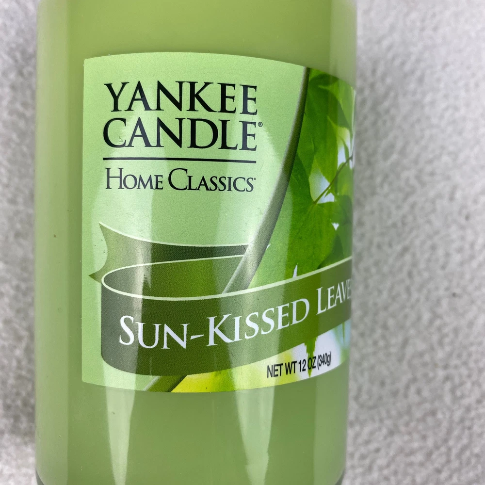 The product is a Yankee Candle in the scent "Sun-Kissed Leaves" in a 12 oz green jar. It is a discontinued scent from the Home Classics line, making it a unique find for candle enthusiasts. The jar/container candle features the signature Yankee Candle branding, offering a refreshing and aromatic fragrance that evokes the essence of sun-kissed leaves.